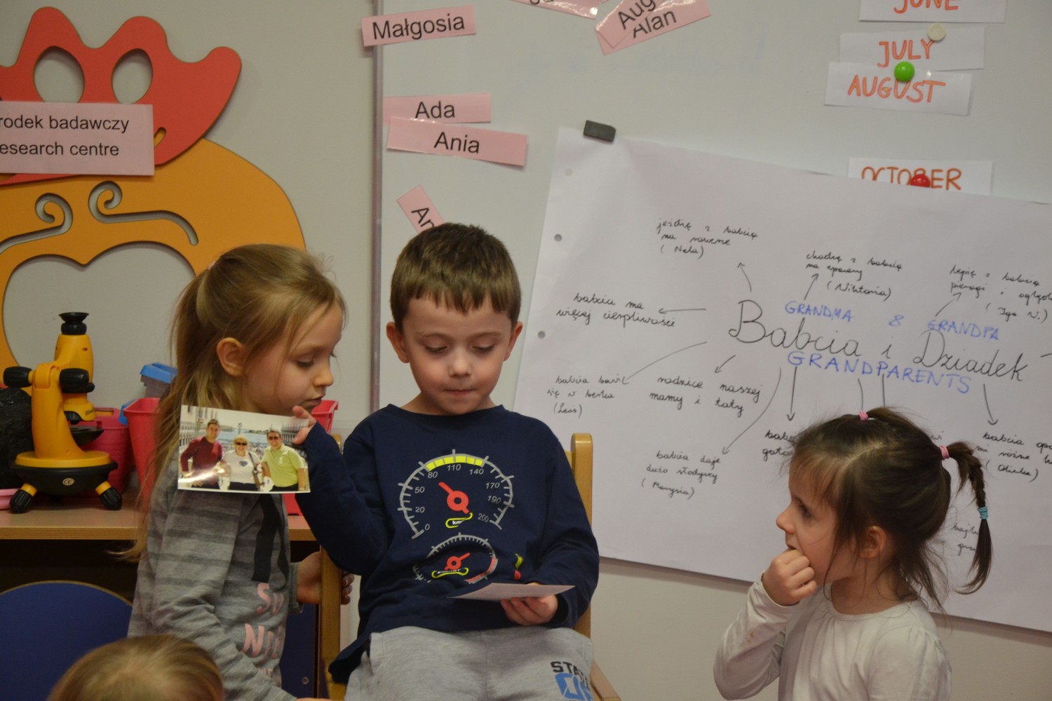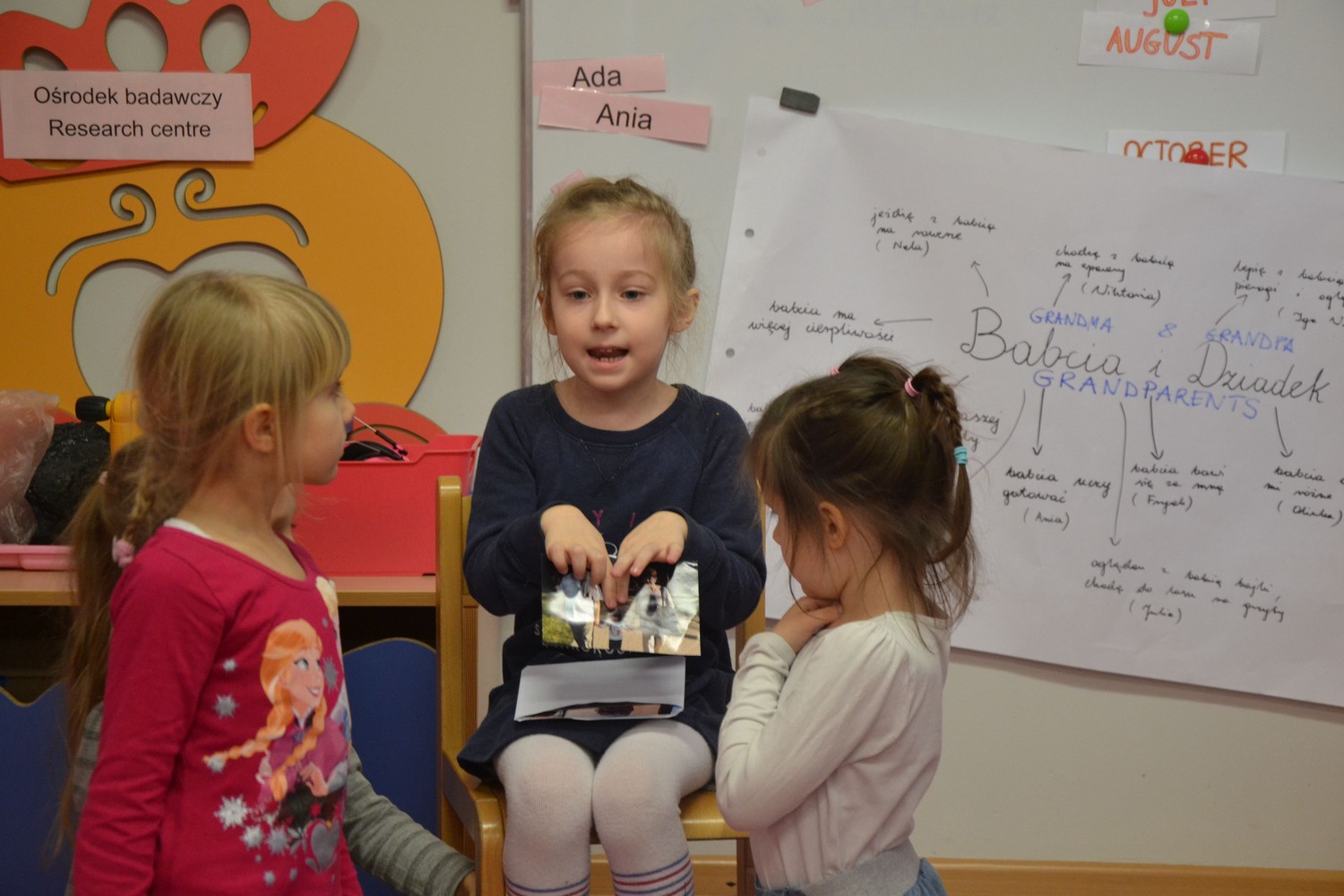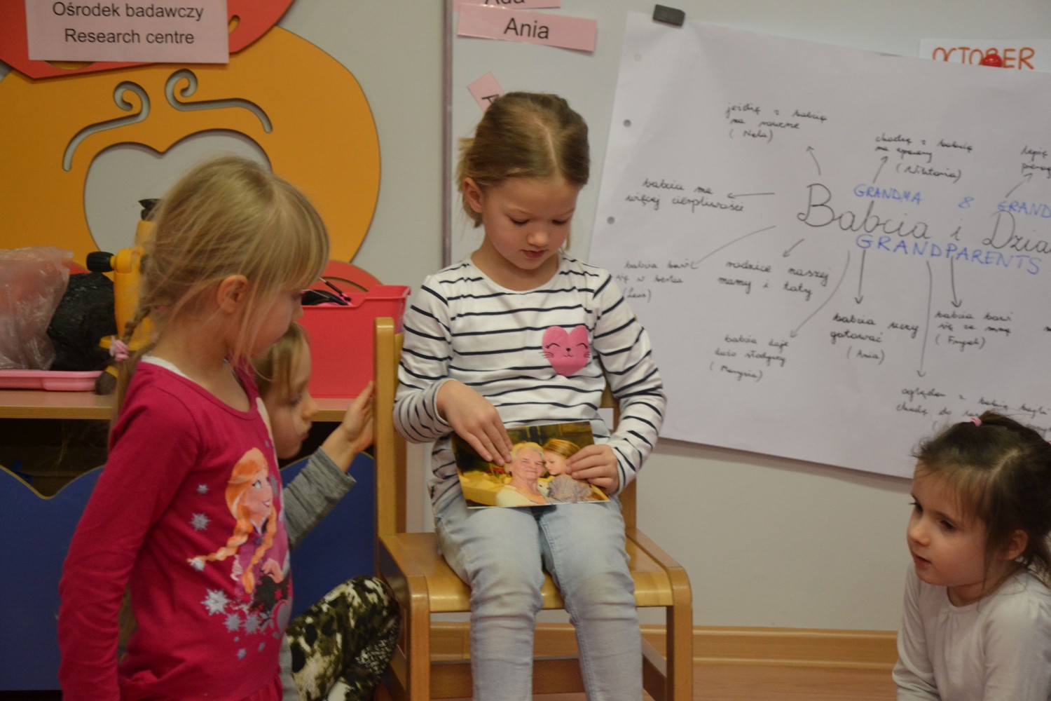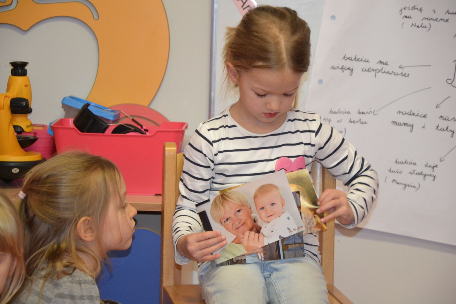Grupa śred­nia­ków chęt­nie pre­zen­to­wała zdję­cia swoich babć i dziad­ków. Dzieci opo­wia­dały o rela­cjach łączą­cych dziad­ków z rodzi­cami oraz o tym, jak lubią spę­dzać z nimi czas.