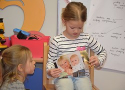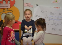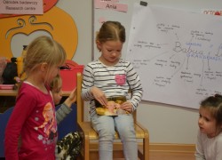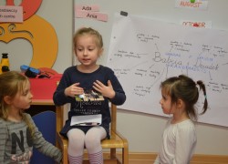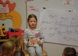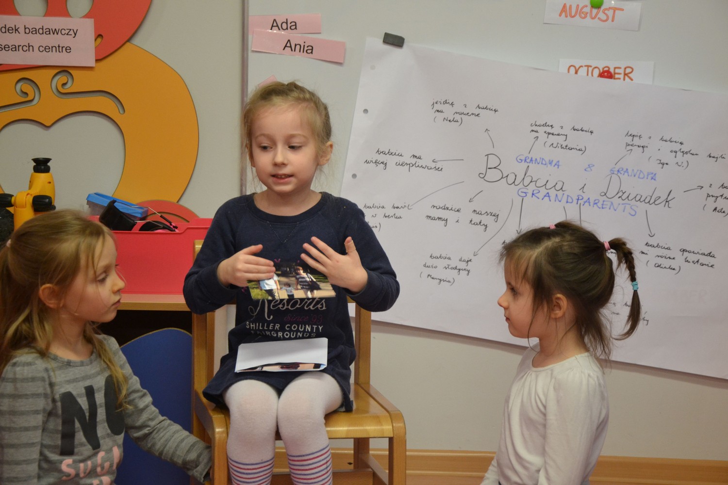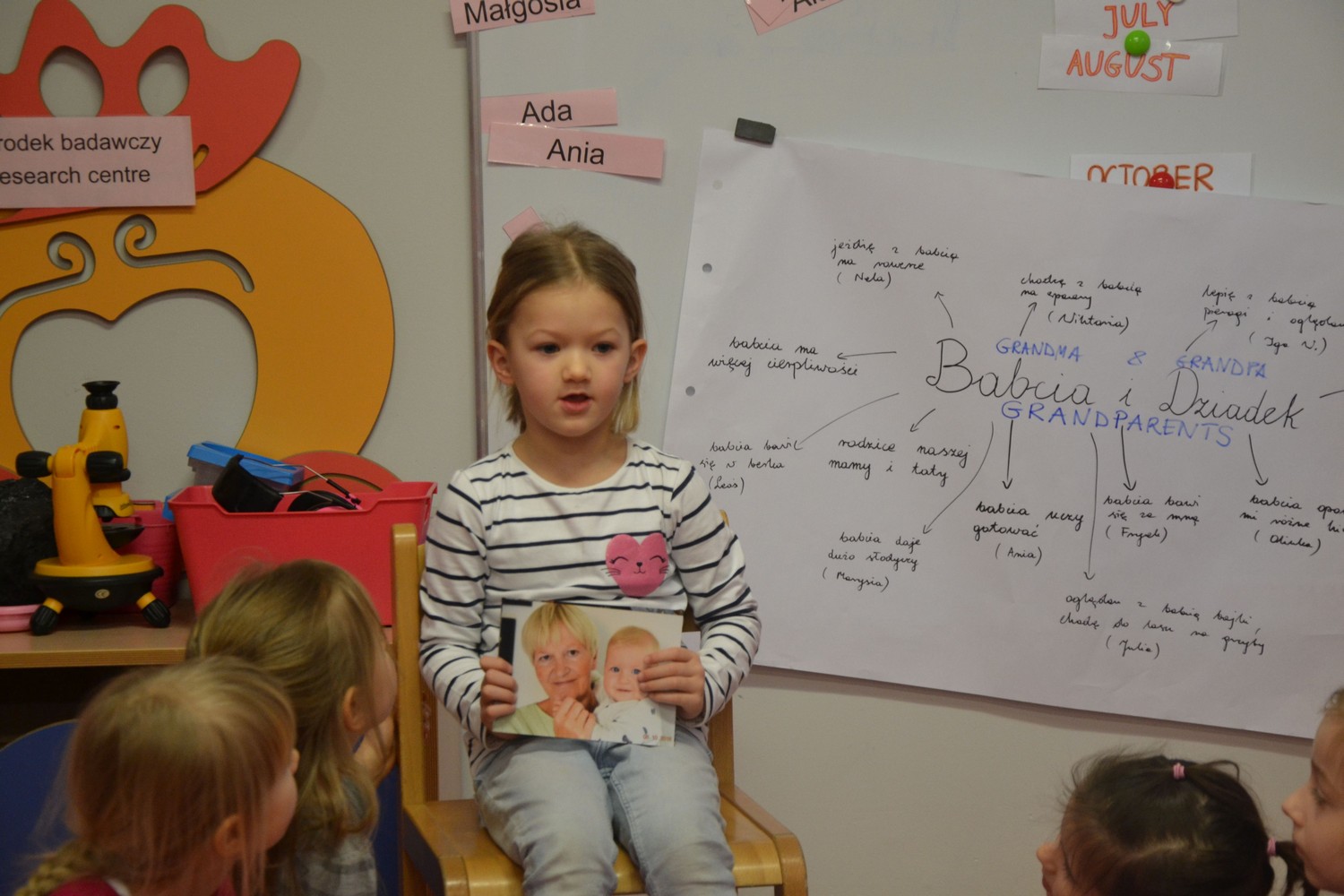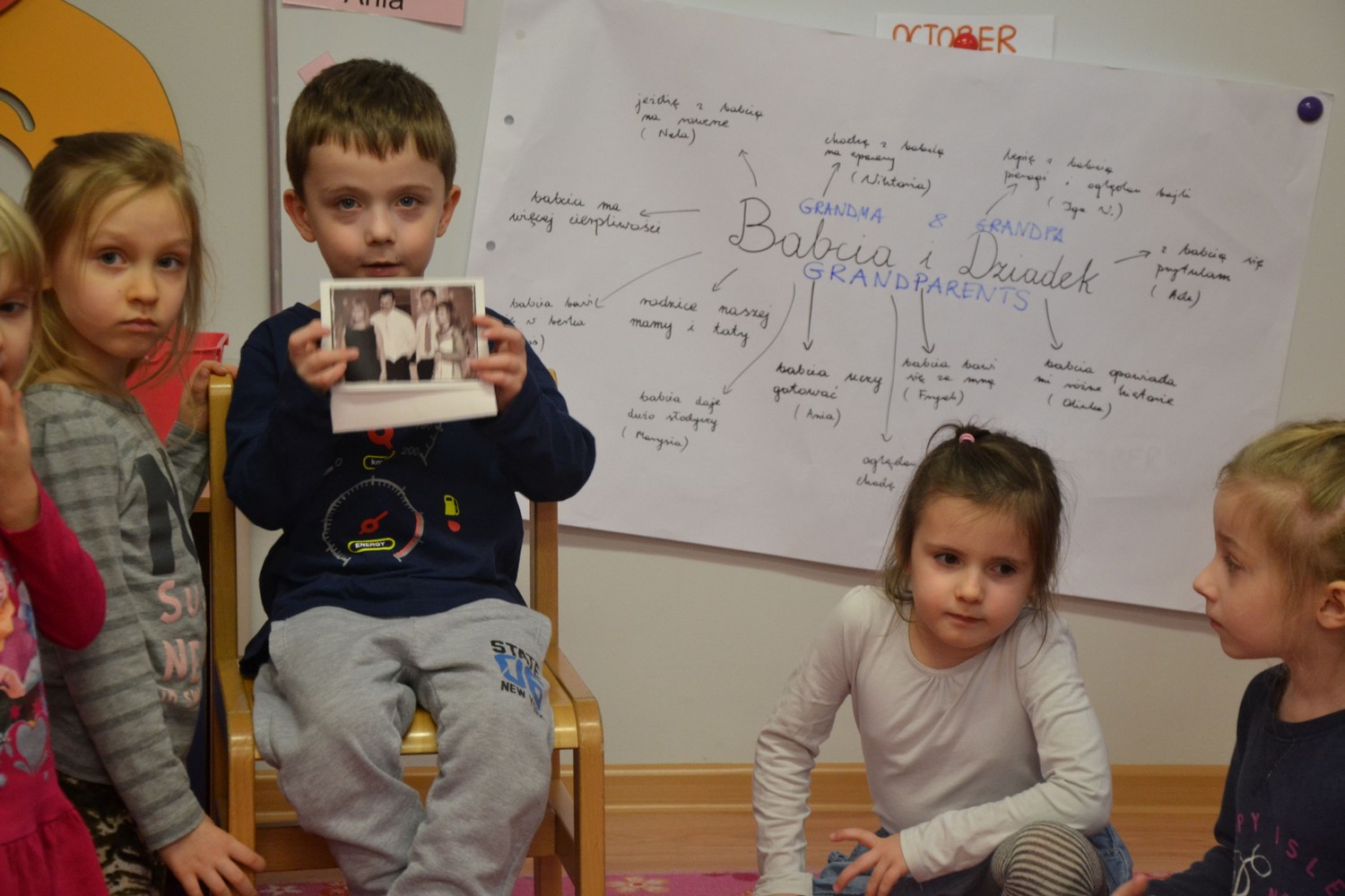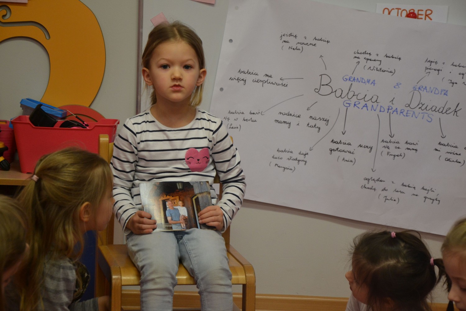 Grupa śred­nia­ków chęt­nie pre­zen­to­wała zdję­cia swoich babć i dziad­ków. Dzieci opo­wia­dały o rela­cjach łączą­cych dziad­ków z rodzi­cami oraz o tym, jak lubią spę­dzać z nimi czas.