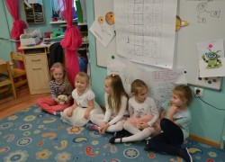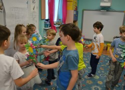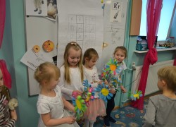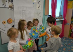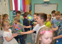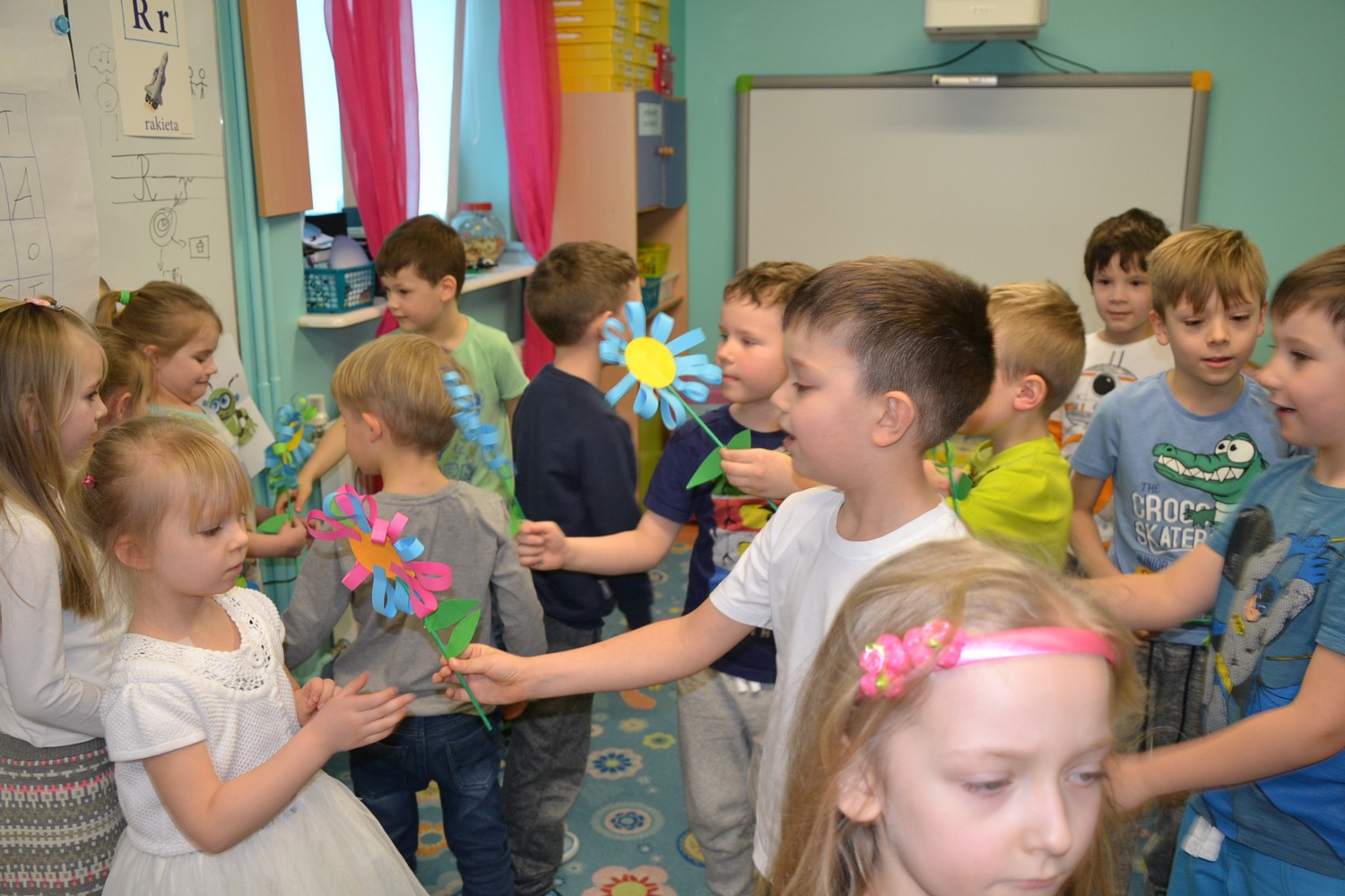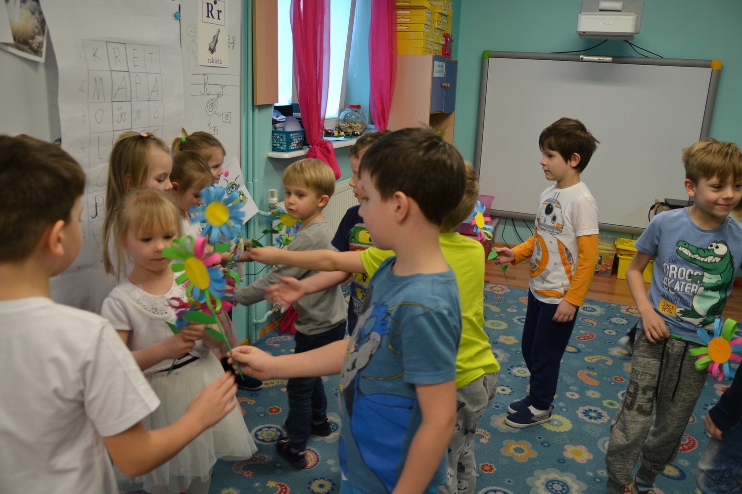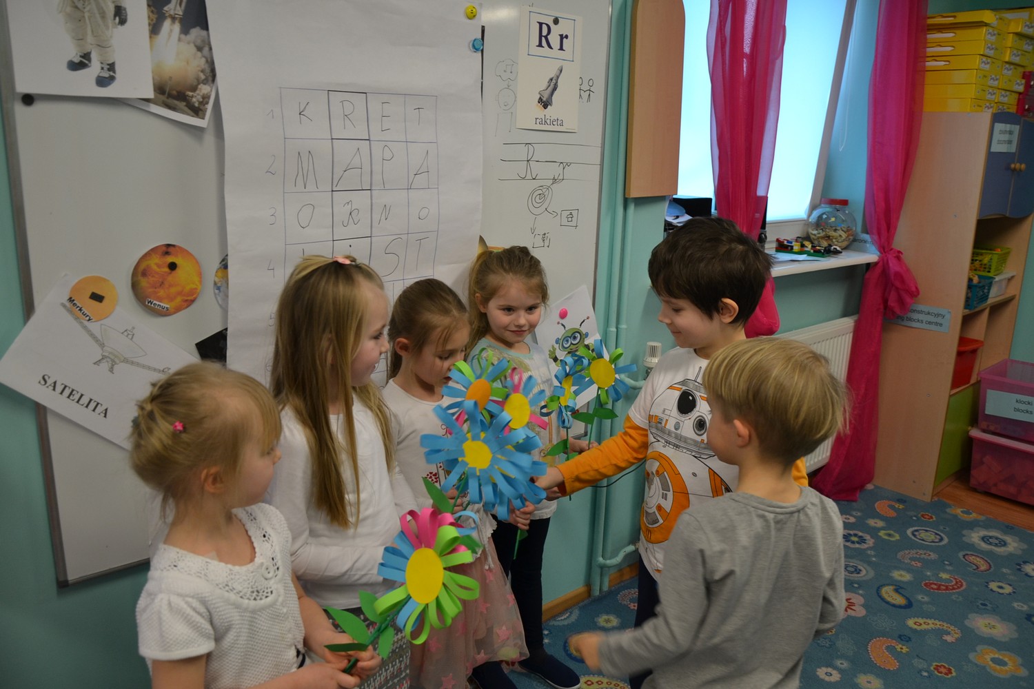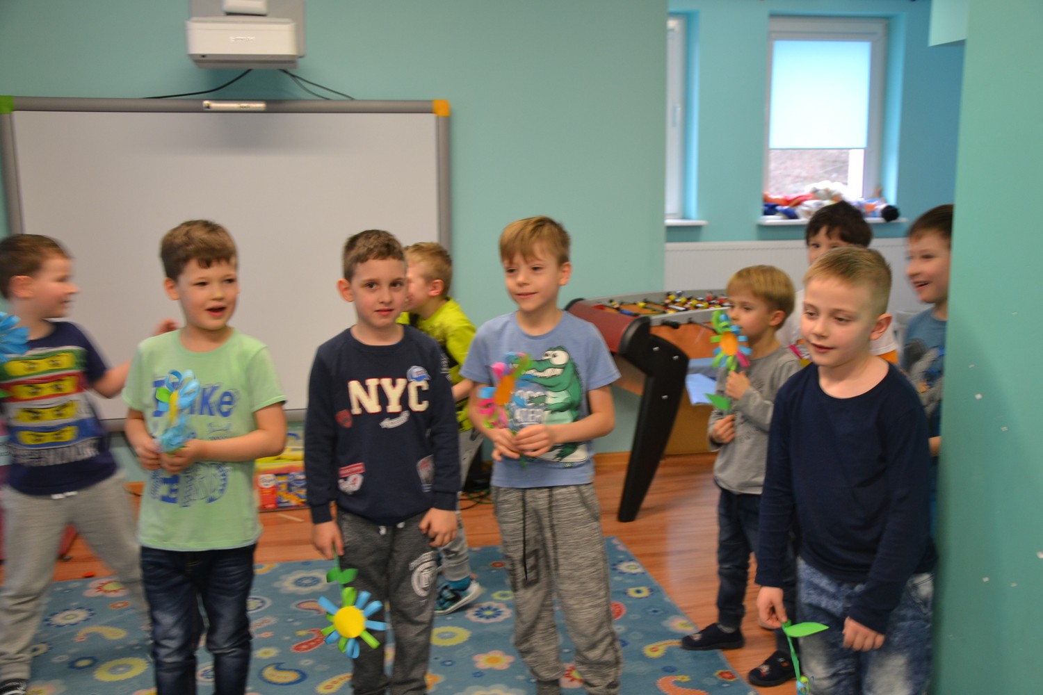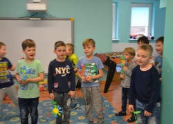 Z okazji święta chłopcy przy­go­to­wali dziew­czyn­kom nie­spo­dzianki w postaci kwiatka. Następ­nie uro­czy­ście wrę­czyli nie­spo­dzianki, które spra­wiły wiele rado­ści naszym małym kobiet­kom.