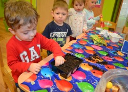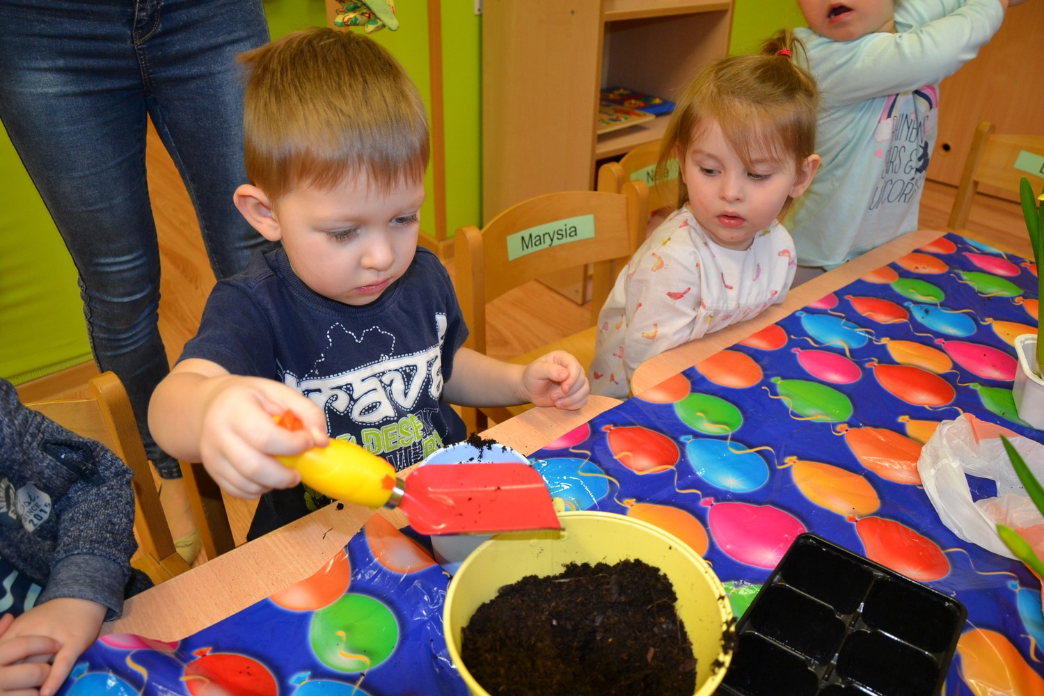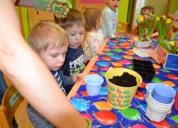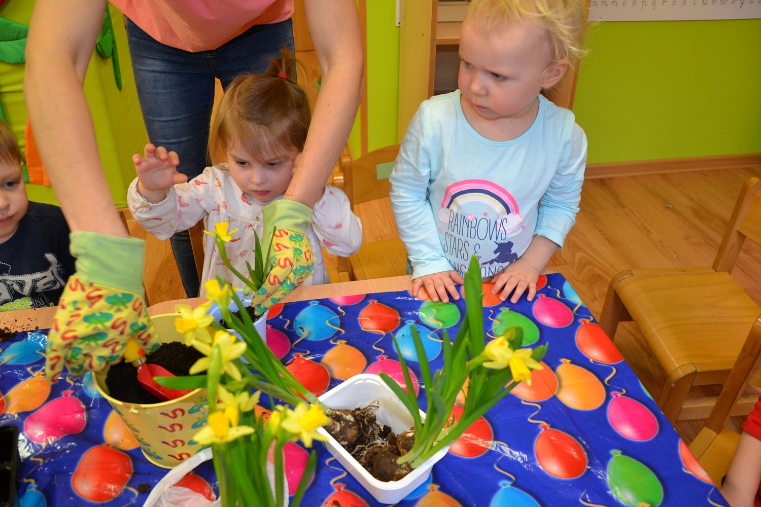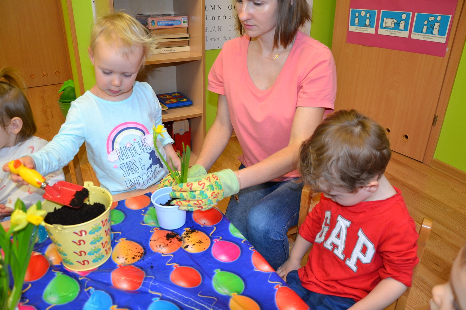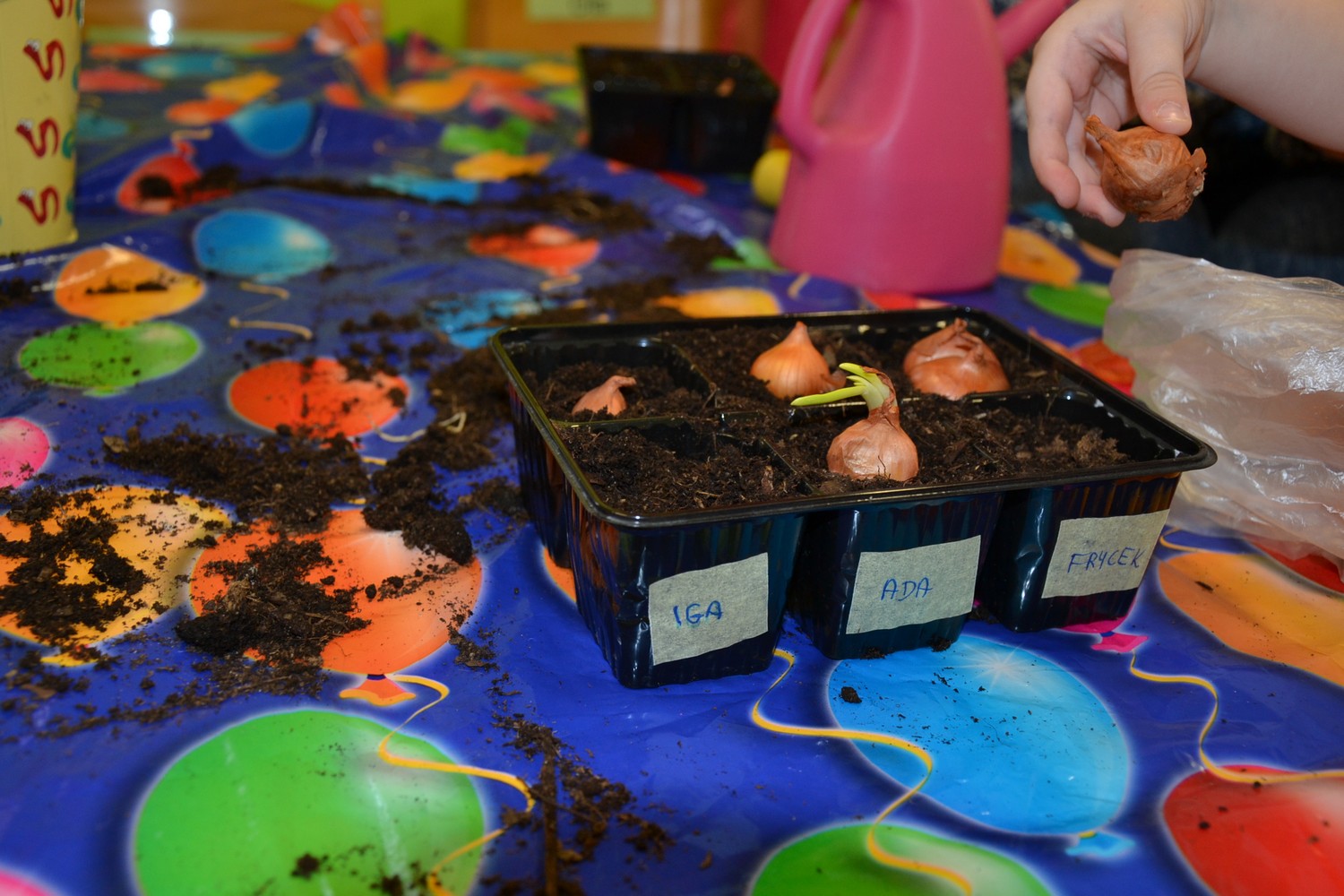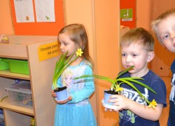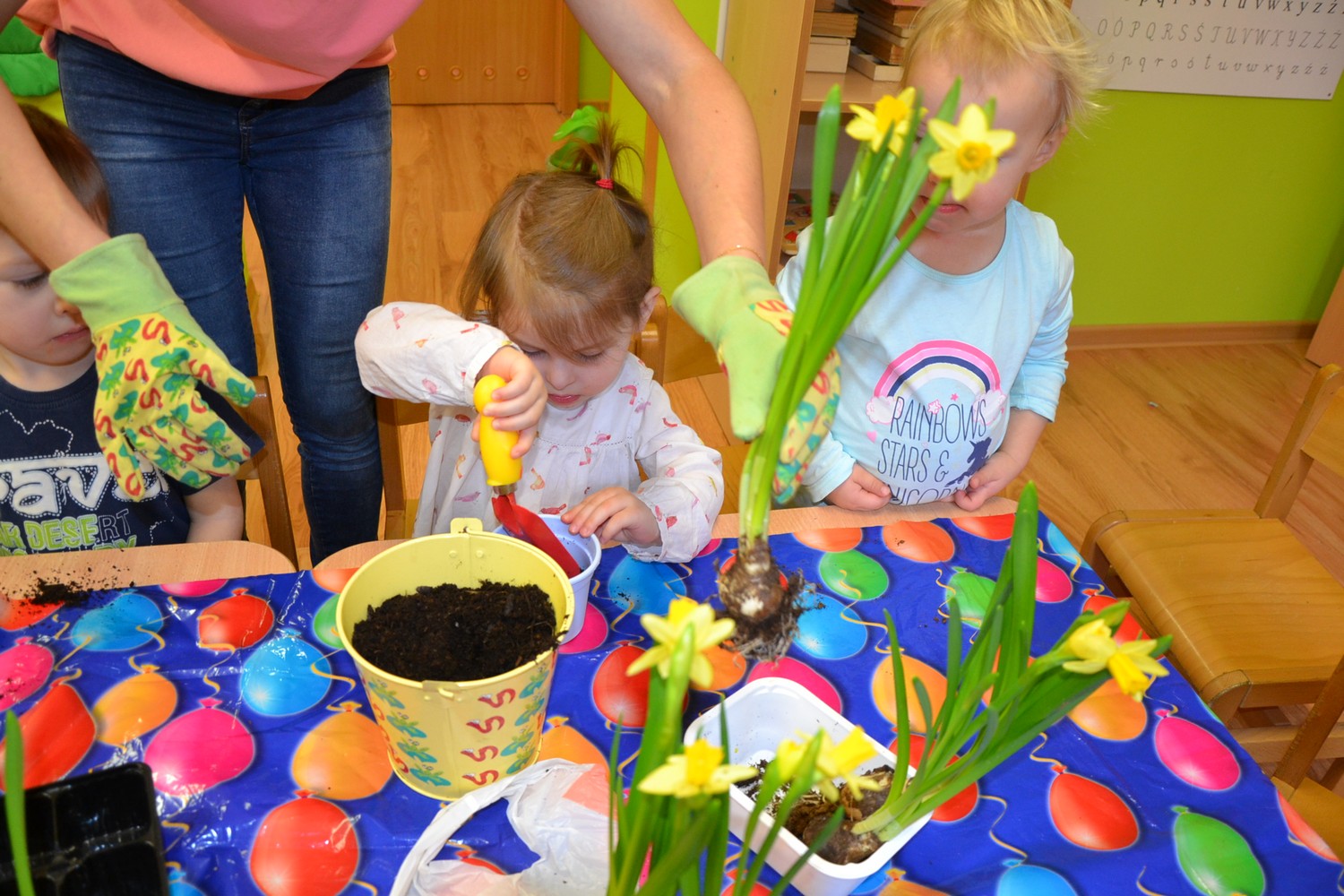 Dzieci z grupy I bardzo chęt­nie włą­czyły się w prace zwią­zane z zakła­da­niem zie­lo­nego ogródka w naszej sali. Sadziły żon­kile, cebulki na szczy­pio­rek oraz nasiona kopru i dyni. Posa­dzo­nymi kwia­tami obda­ro­wały rów­nież dzieci pozo­sta­łych grup.