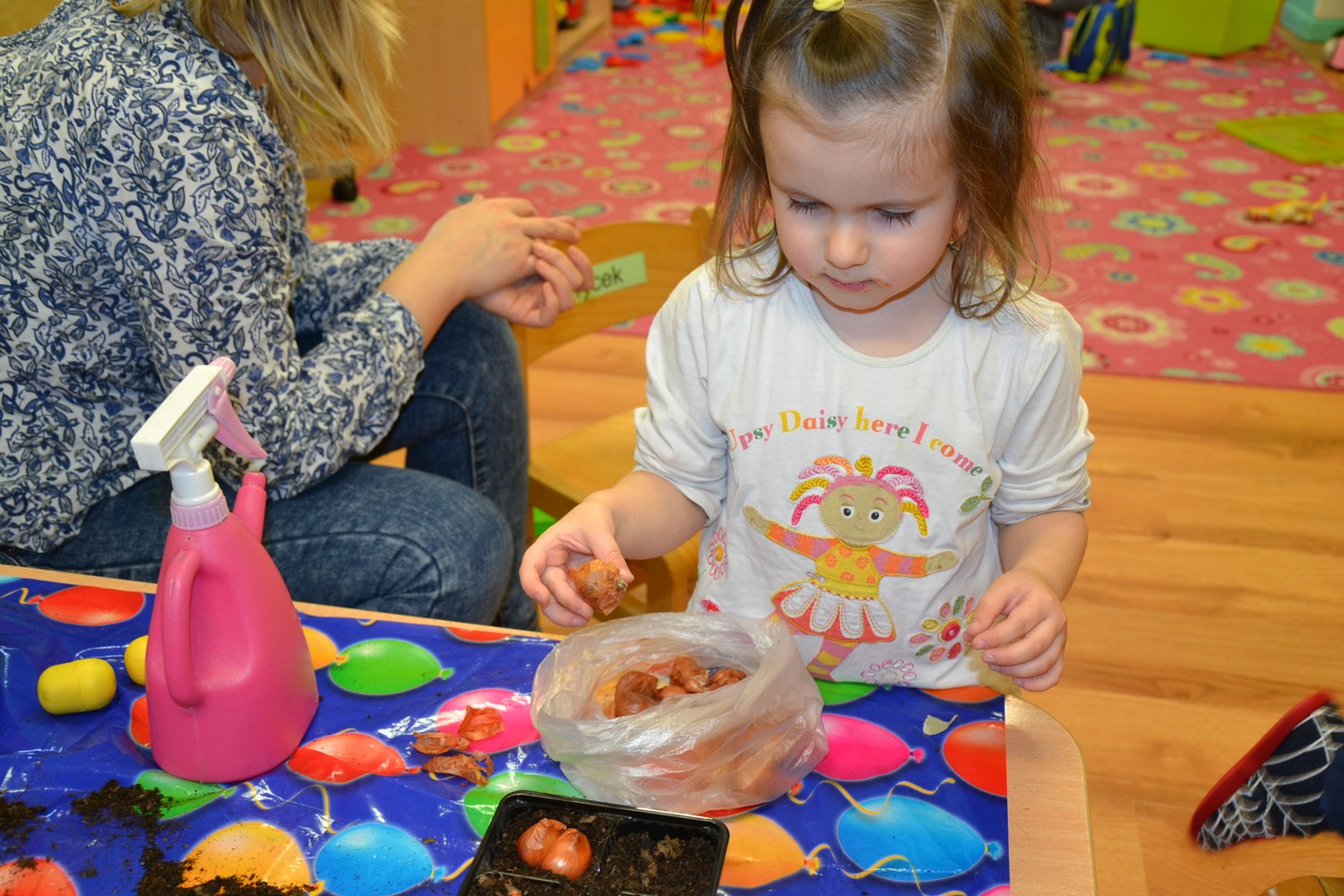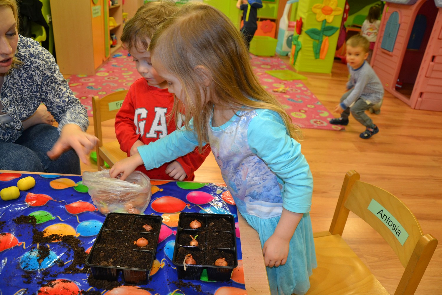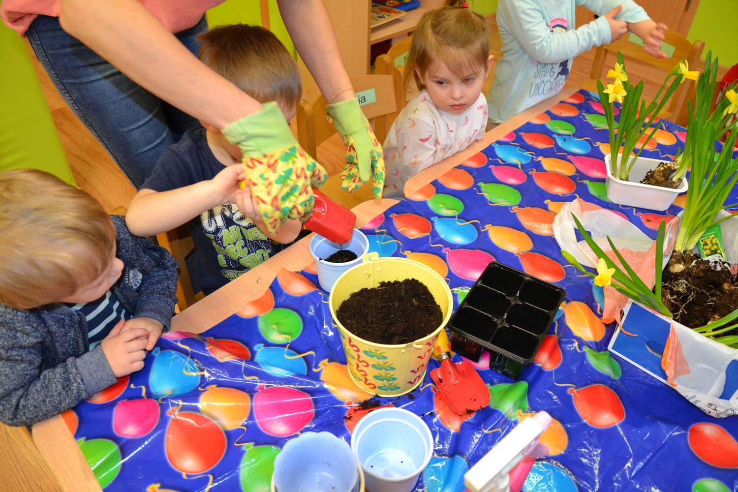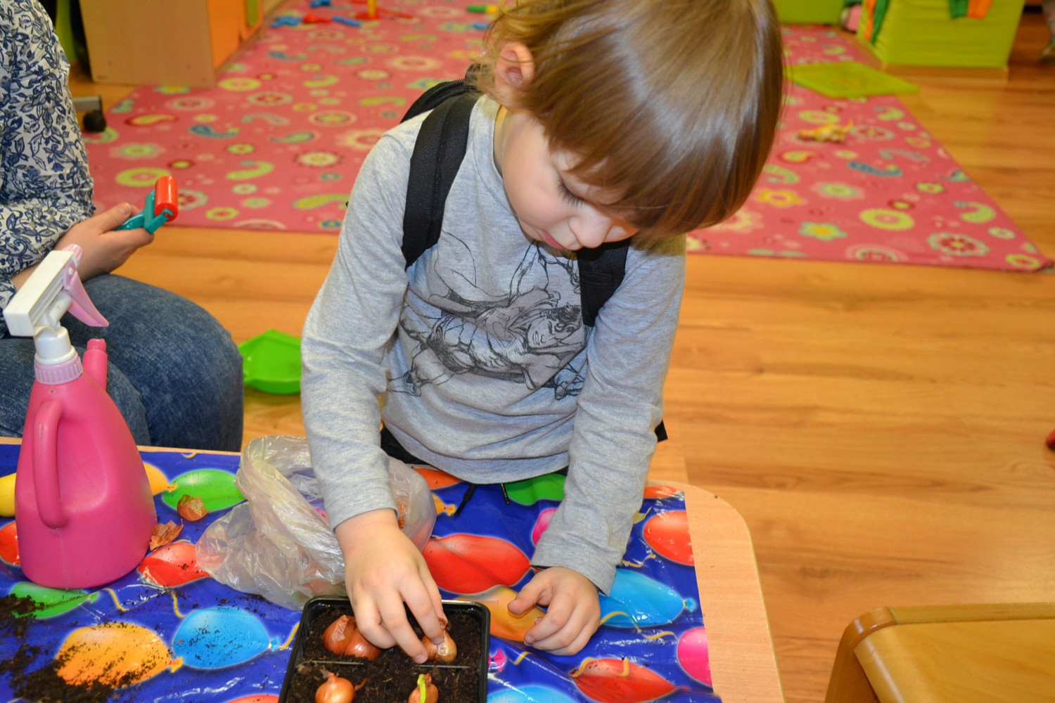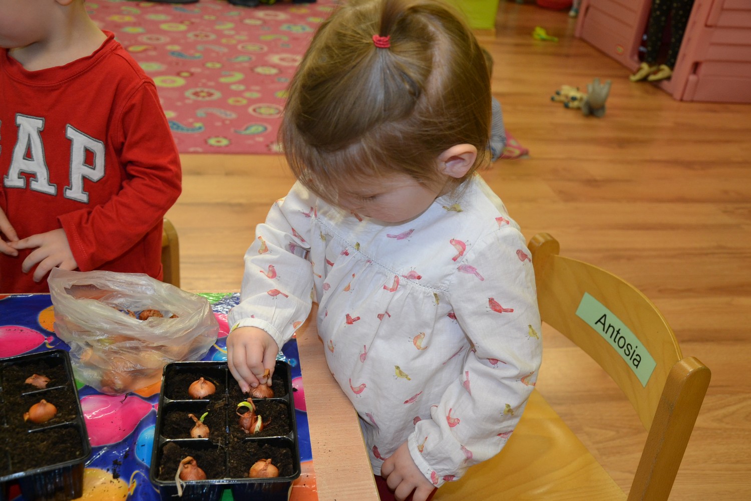 Dzieci z grupy I bardzo chęt­nie włą­czyły się w prace zwią­zane z zakła­da­niem zie­lo­nego ogródka w naszej sali. Sadziły żon­kile, cebulki na szczy­pio­rek oraz nasiona kopru i dyni. Posa­dzo­nymi kwia­tami obda­ro­wały rów­nież dzieci pozo­sta­łych grup.
