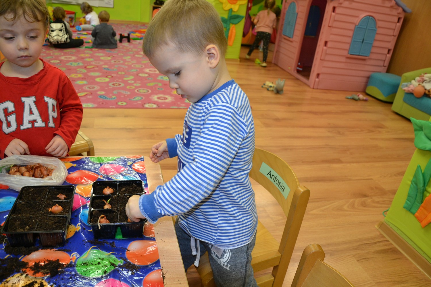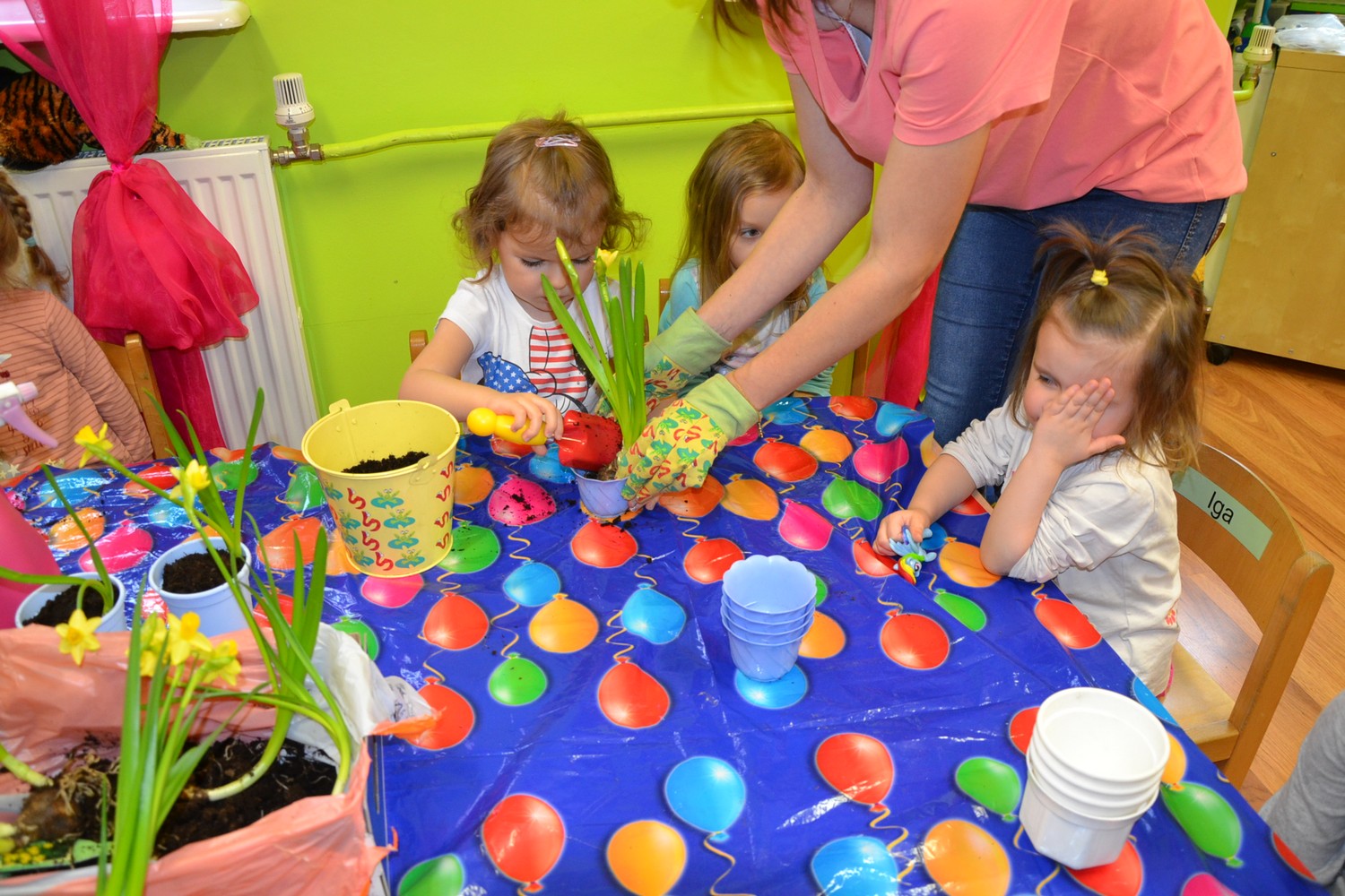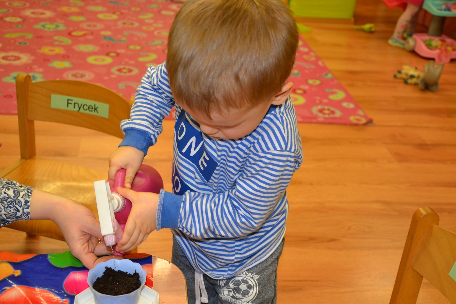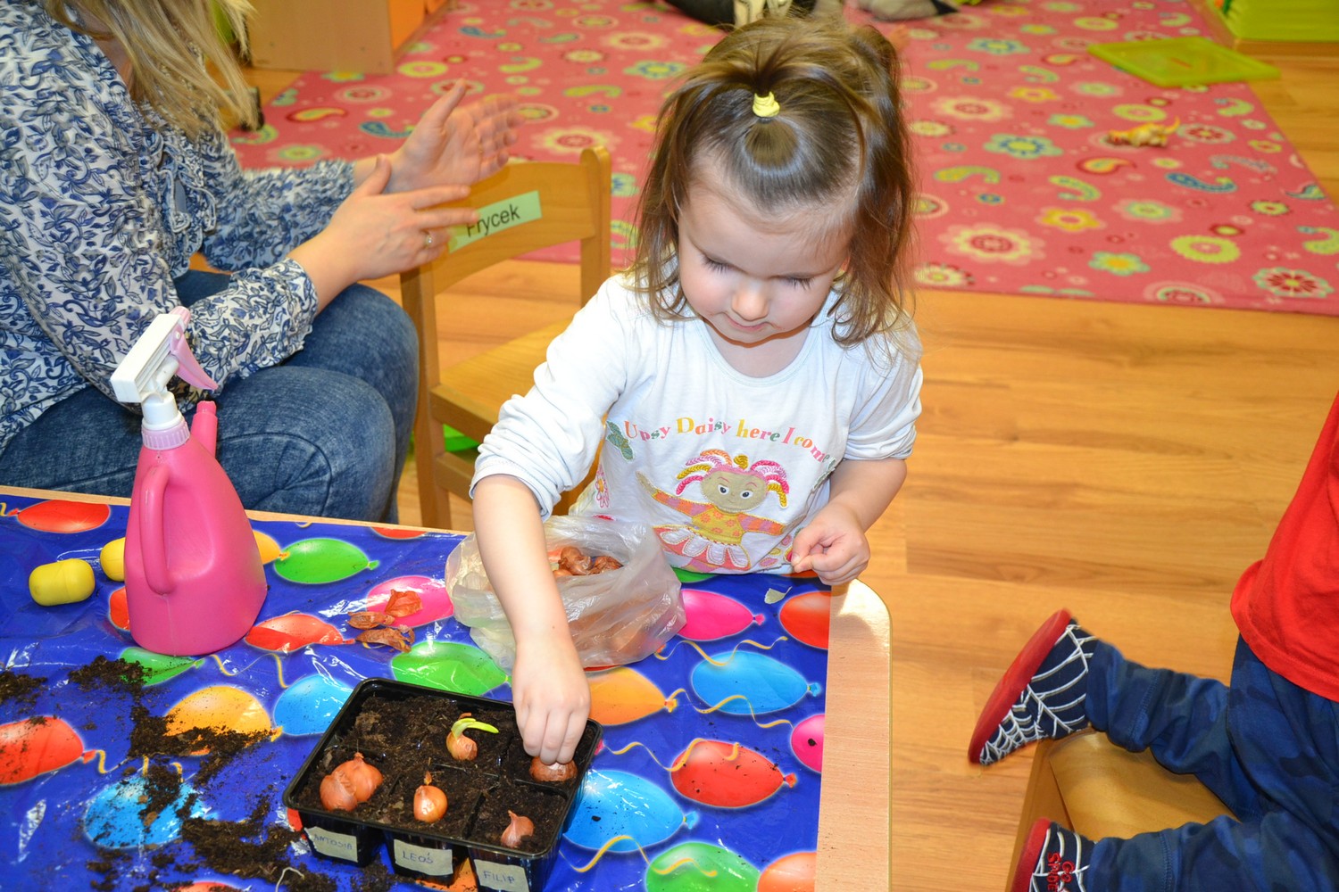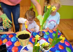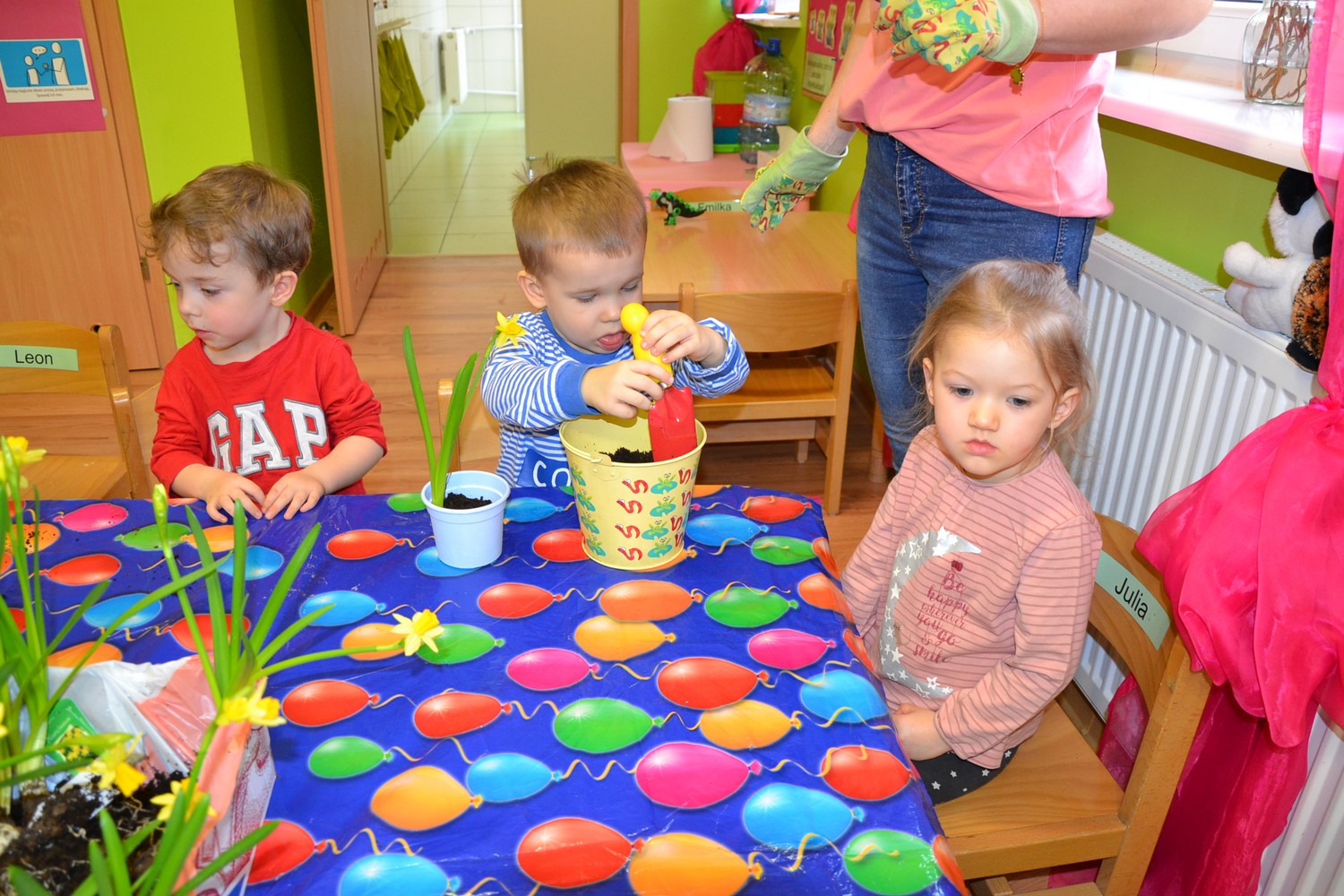 Dzieci z grupy I bardzo chęt­nie włą­czyły się w prace zwią­zane z zakła­da­niem zie­lo­nego ogródka w naszej sali. Sadziły żon­kile, cebulki na szczy­pio­rek oraz nasiona kopru i dyni. Posa­dzo­nymi kwia­tami obda­ro­wały rów­nież dzieci pozo­sta­łych grup.