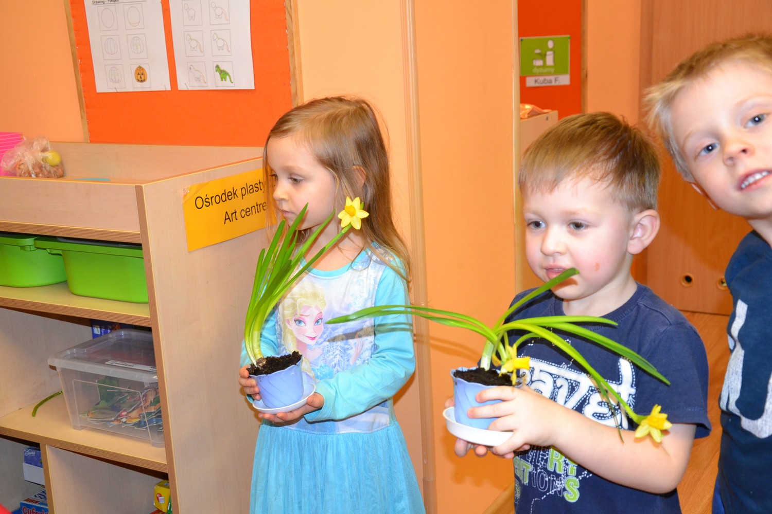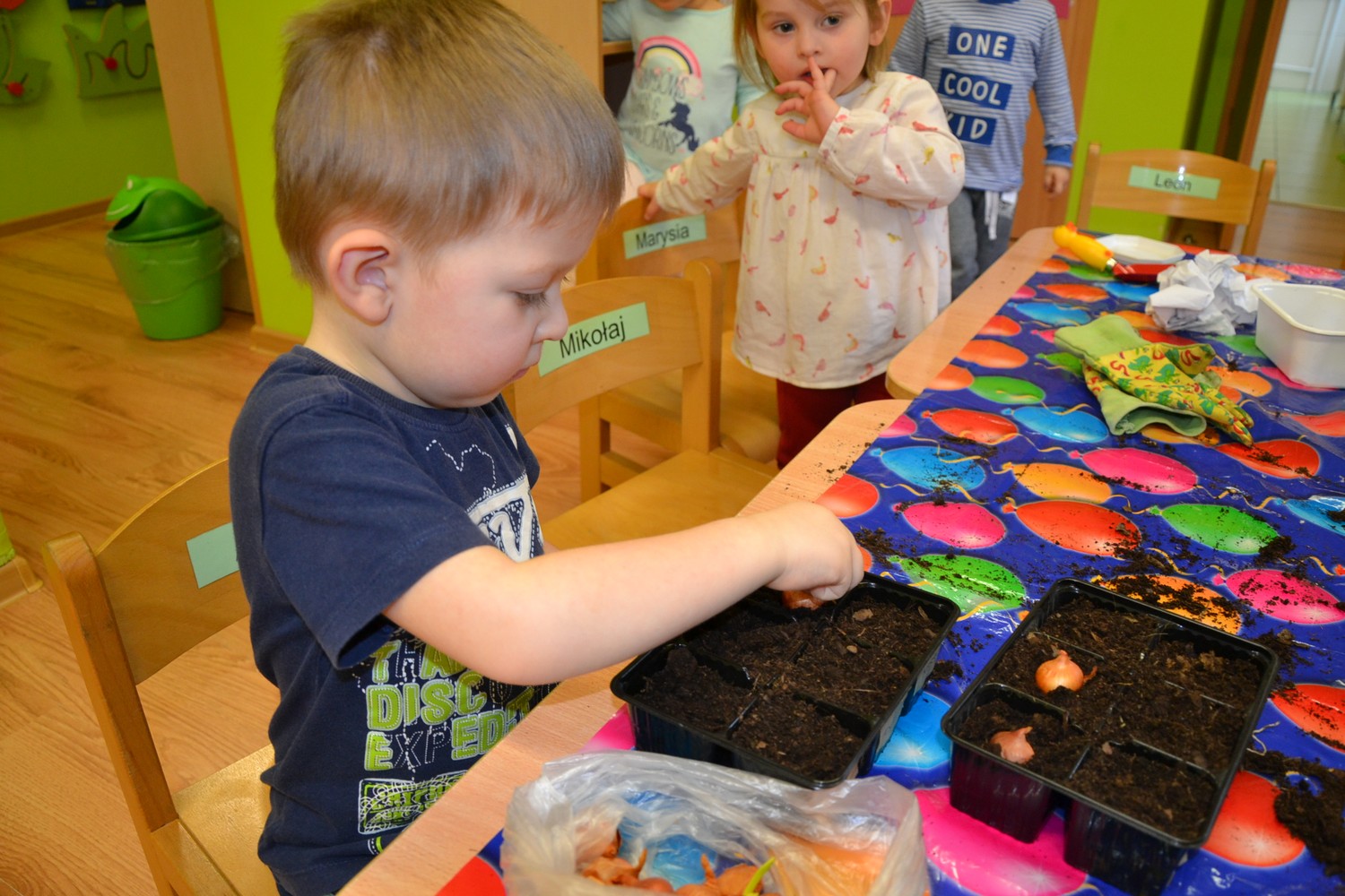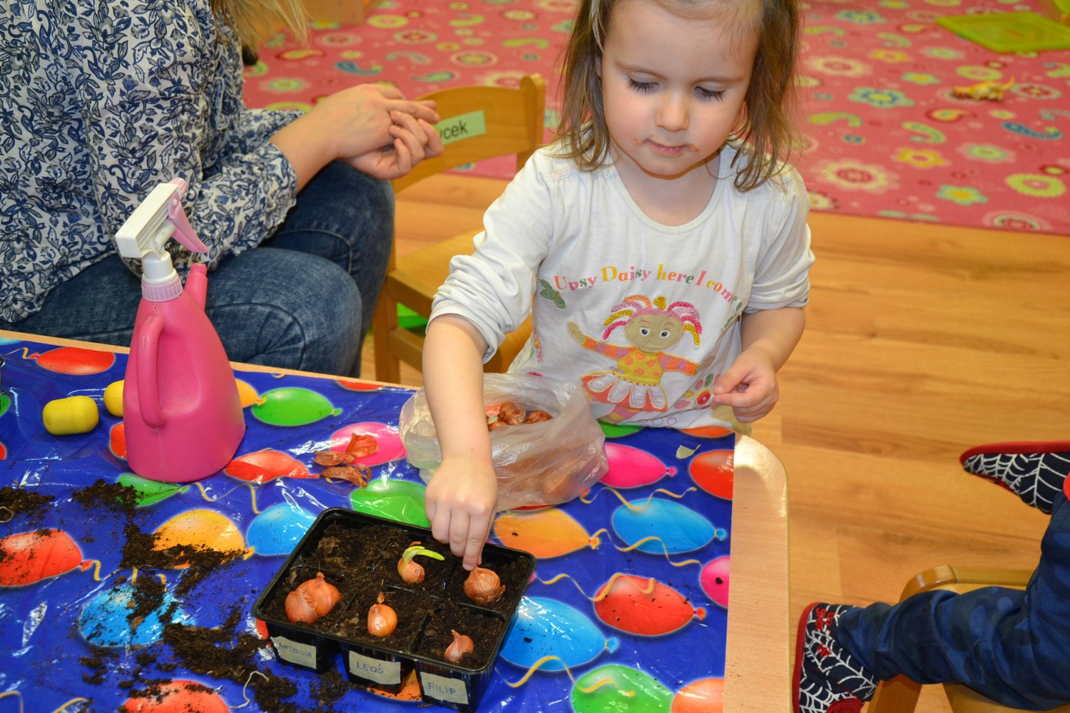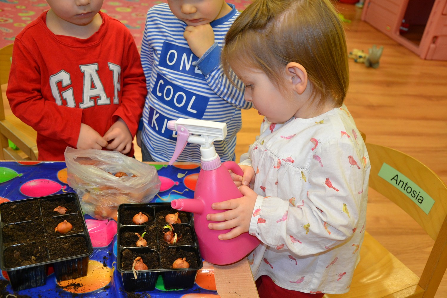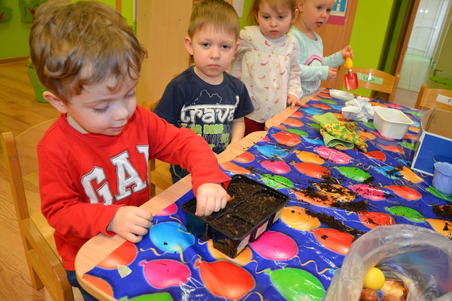 Dzieci z grupy I bardzo chęt­nie włą­czyły się w prace zwią­zane z zakła­da­niem zie­lo­nego ogródka w naszej sali. Sadziły żon­kile, cebulki na szczy­pio­rek oraz nasiona kopru i dyni. Posa­dzo­nymi kwia­tami obda­ro­wały rów­nież dzieci pozo­sta­łych grup.