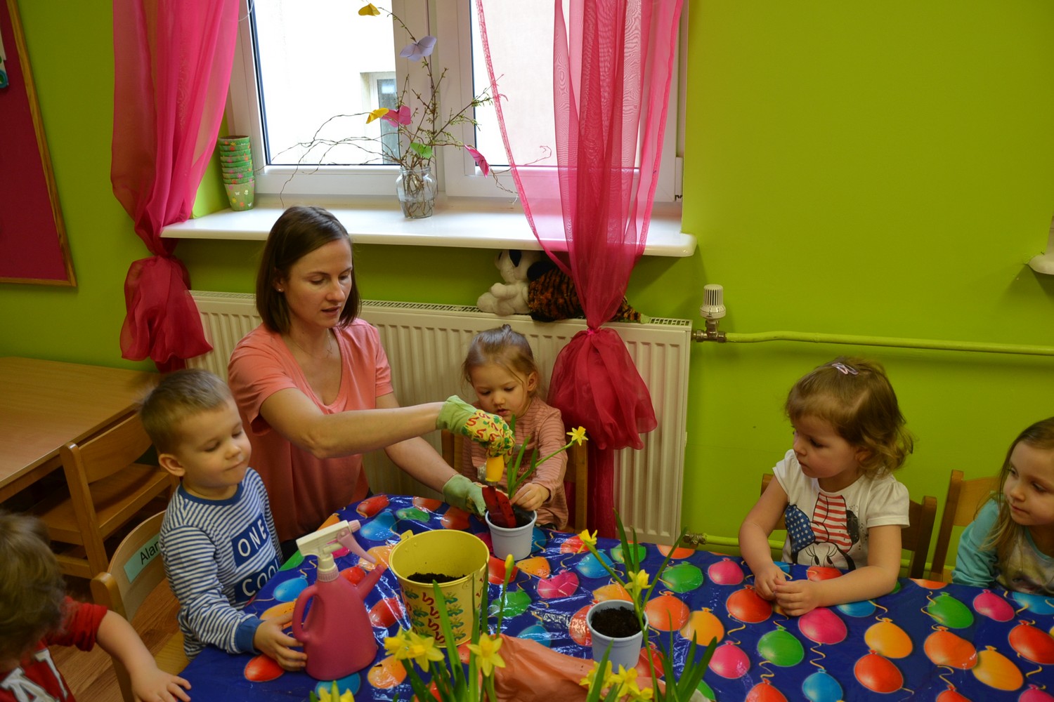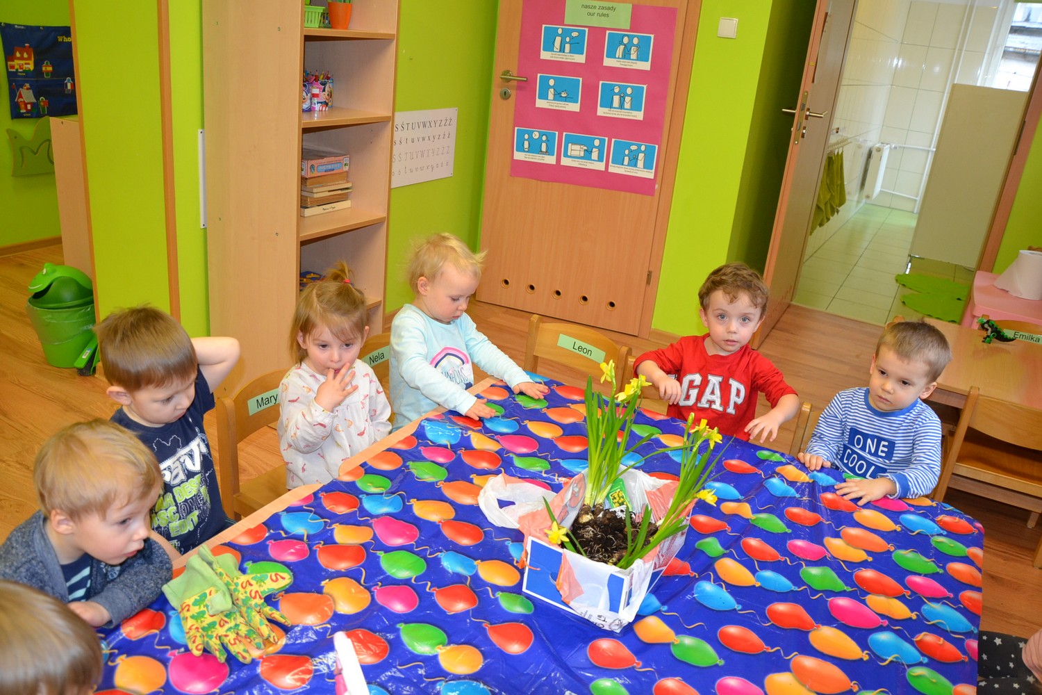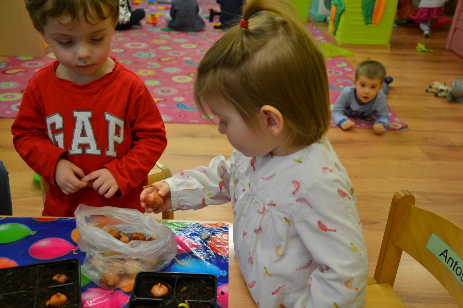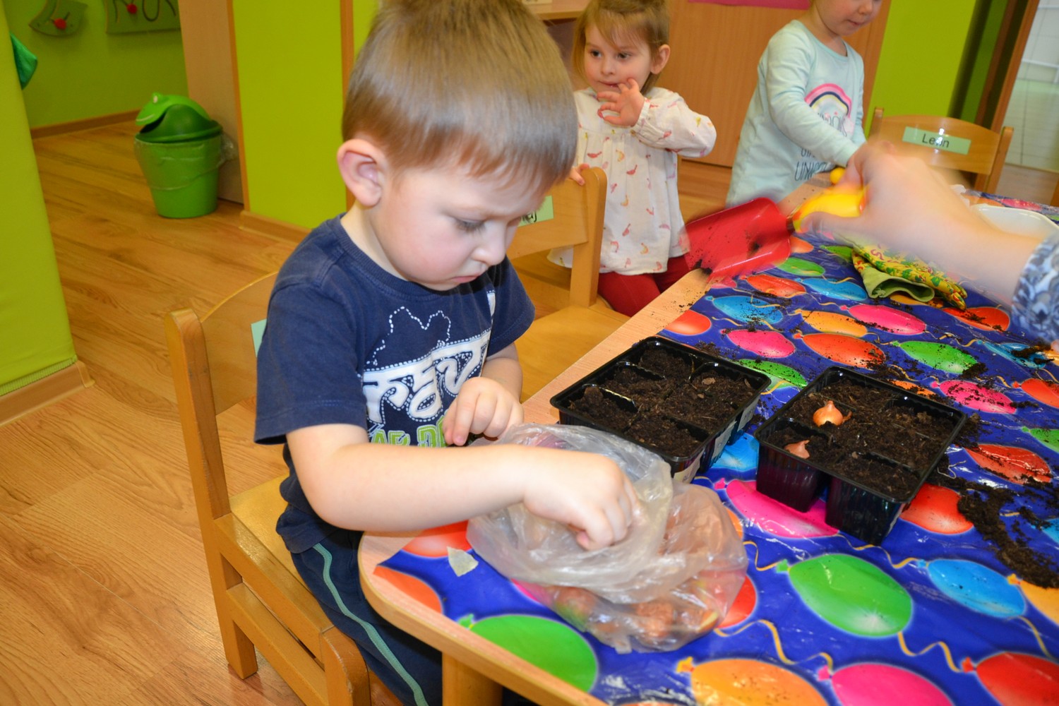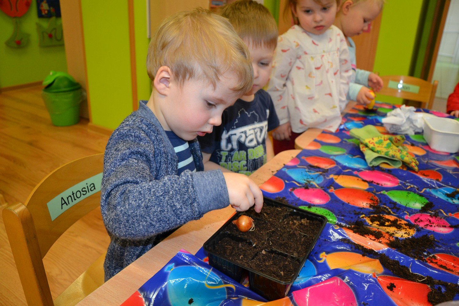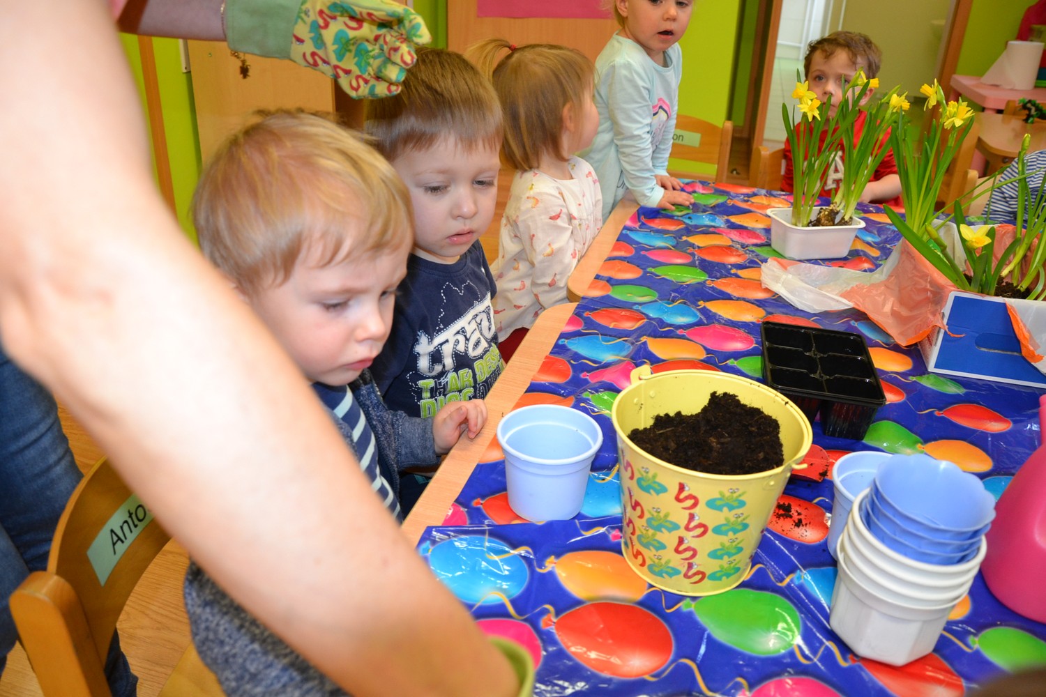 Dzieci z grupy I bardzo chęt­nie włą­czyły się w prace zwią­zane z zakła­da­niem zie­lo­nego ogródka w naszej sali. Sadziły żon­kile, cebulki na szczy­pio­rek oraz nasiona kopru i dyni. Posa­dzo­nymi kwia­tami obda­ro­wały rów­nież dzieci pozo­sta­łych grup.
