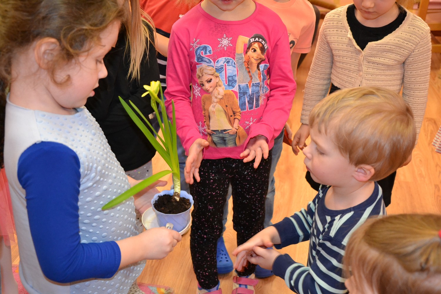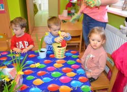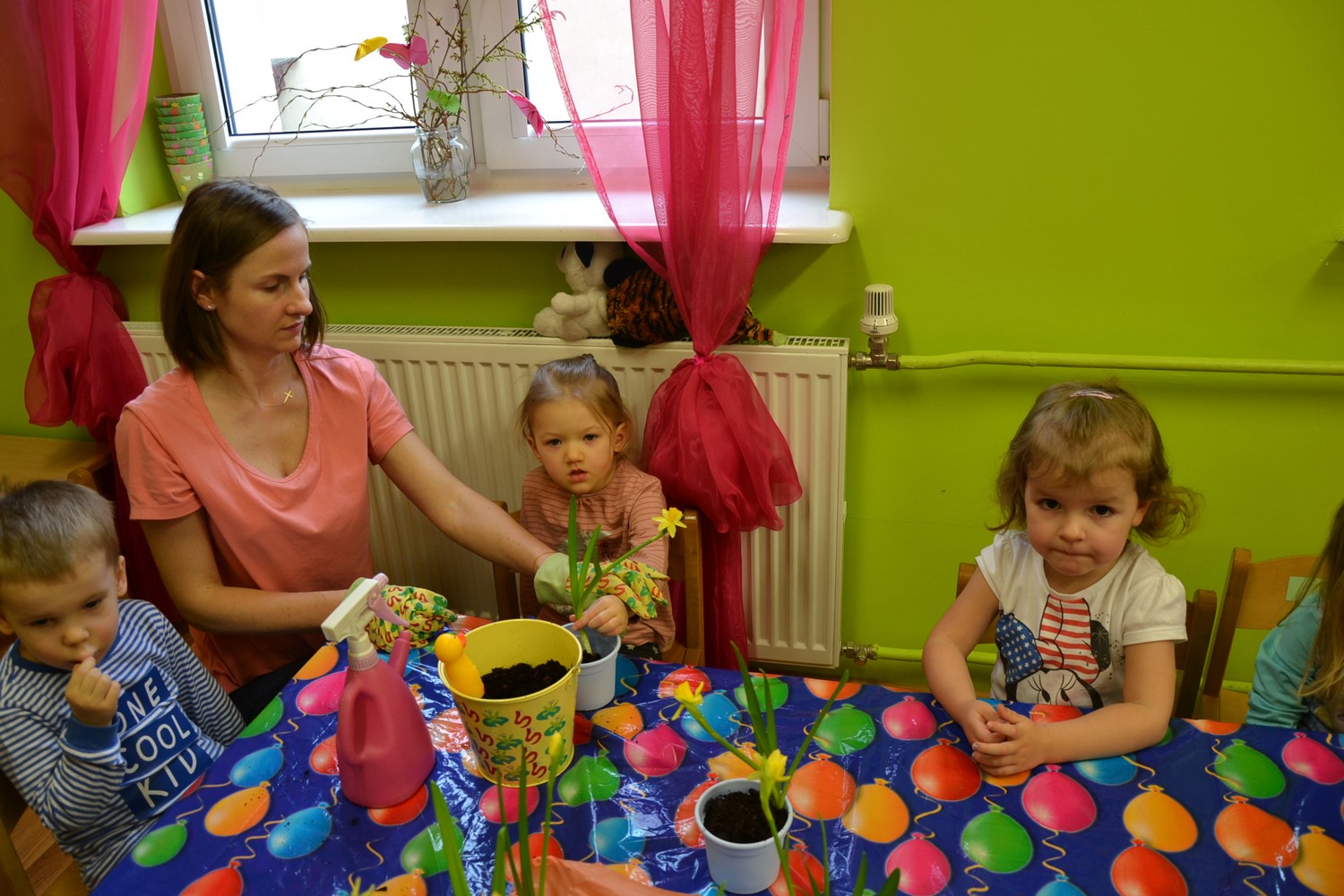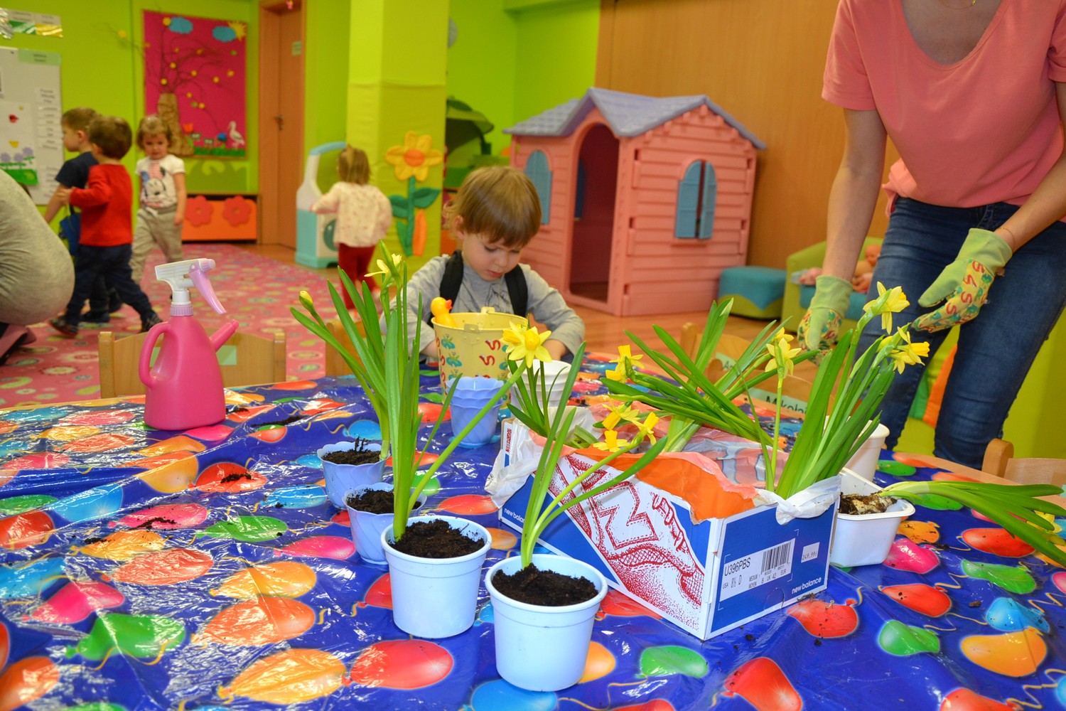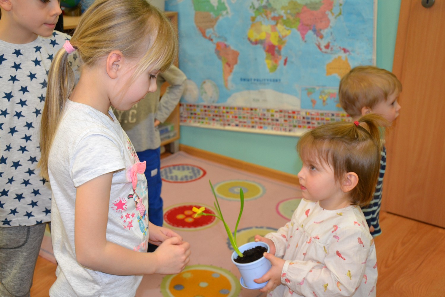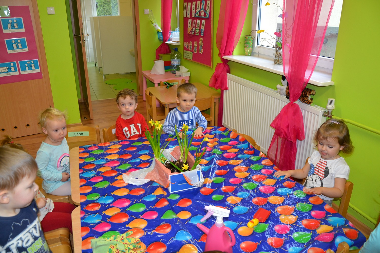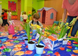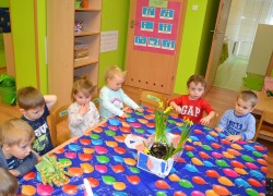 Dzieci z grupy I bardzo chęt­nie włą­czyły się w prace zwią­zane z zakła­da­niem zie­lo­nego ogródka w naszej sali. Sadziły żon­kile, cebulki na szczy­pio­rek oraz nasiona kopru i dyni. Posa­dzo­nymi kwia­tami obda­ro­wały rów­nież dzieci pozo­sta­łych grup.