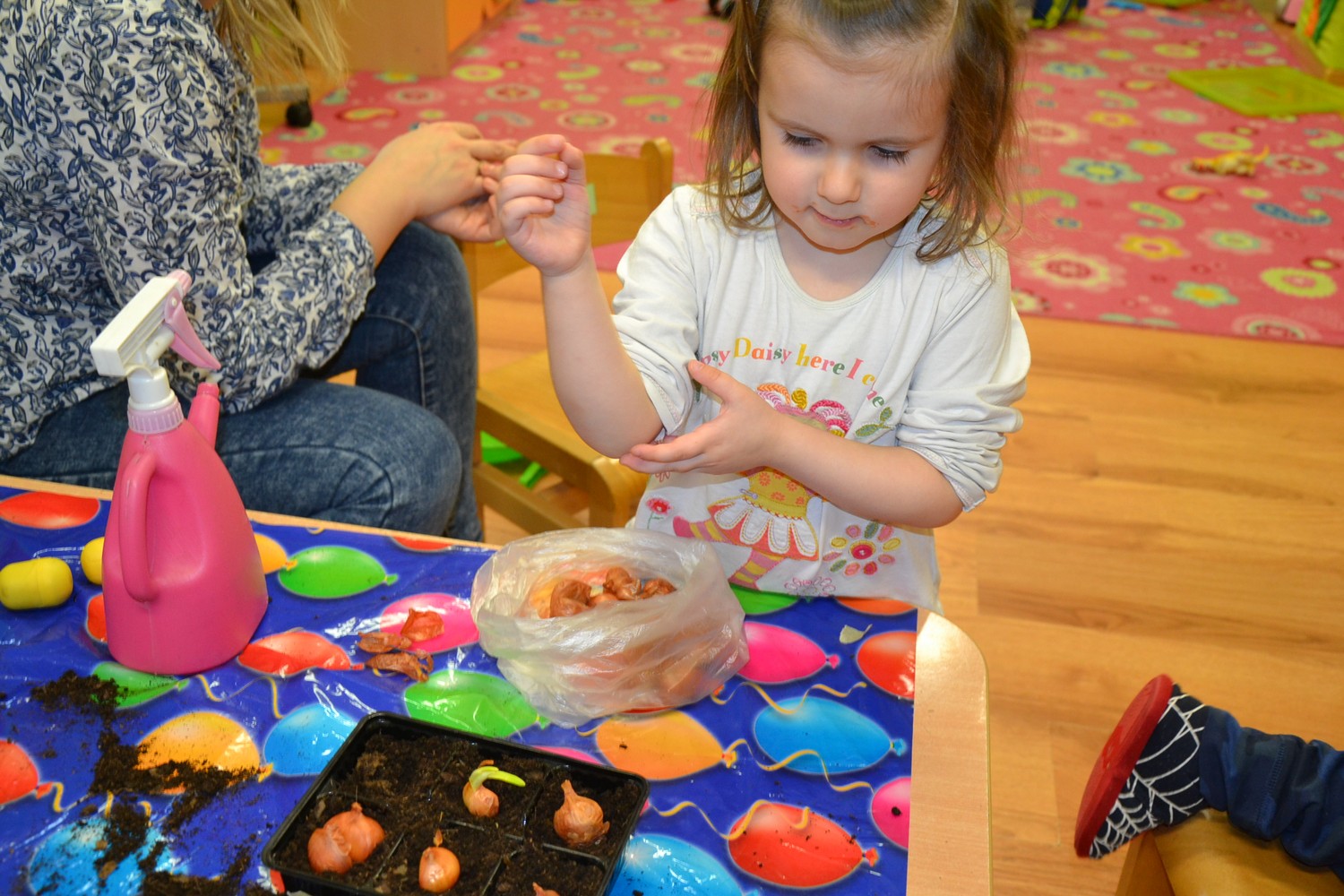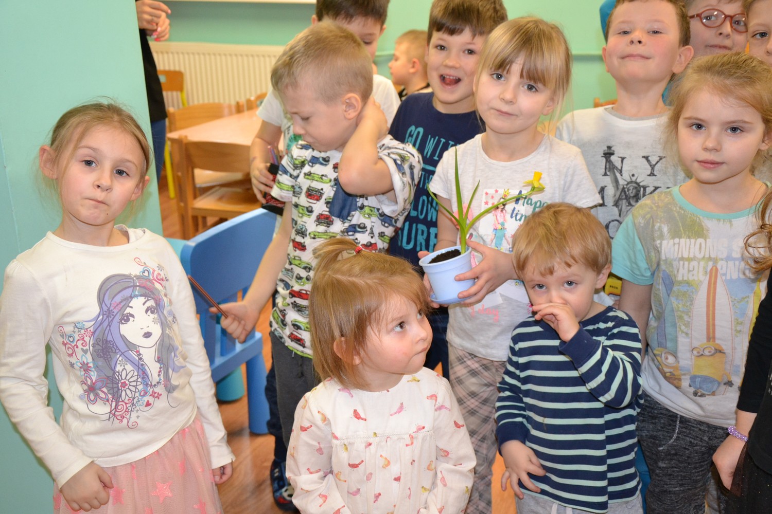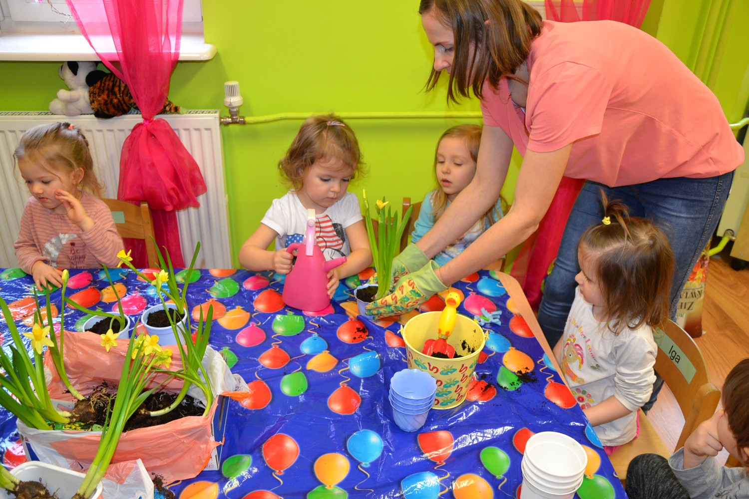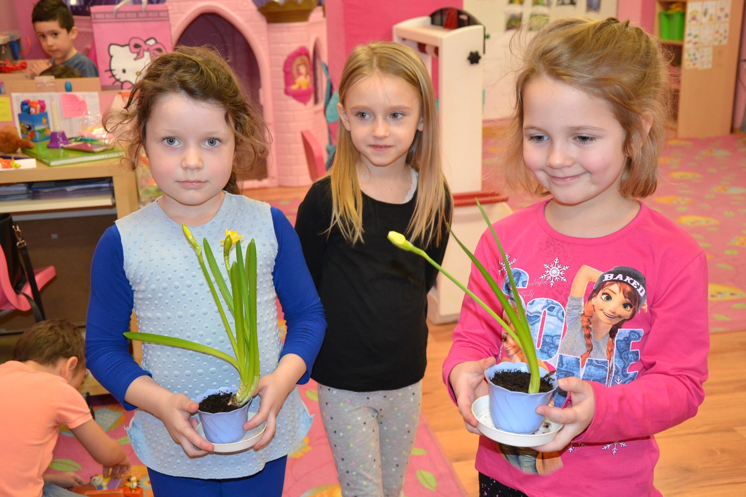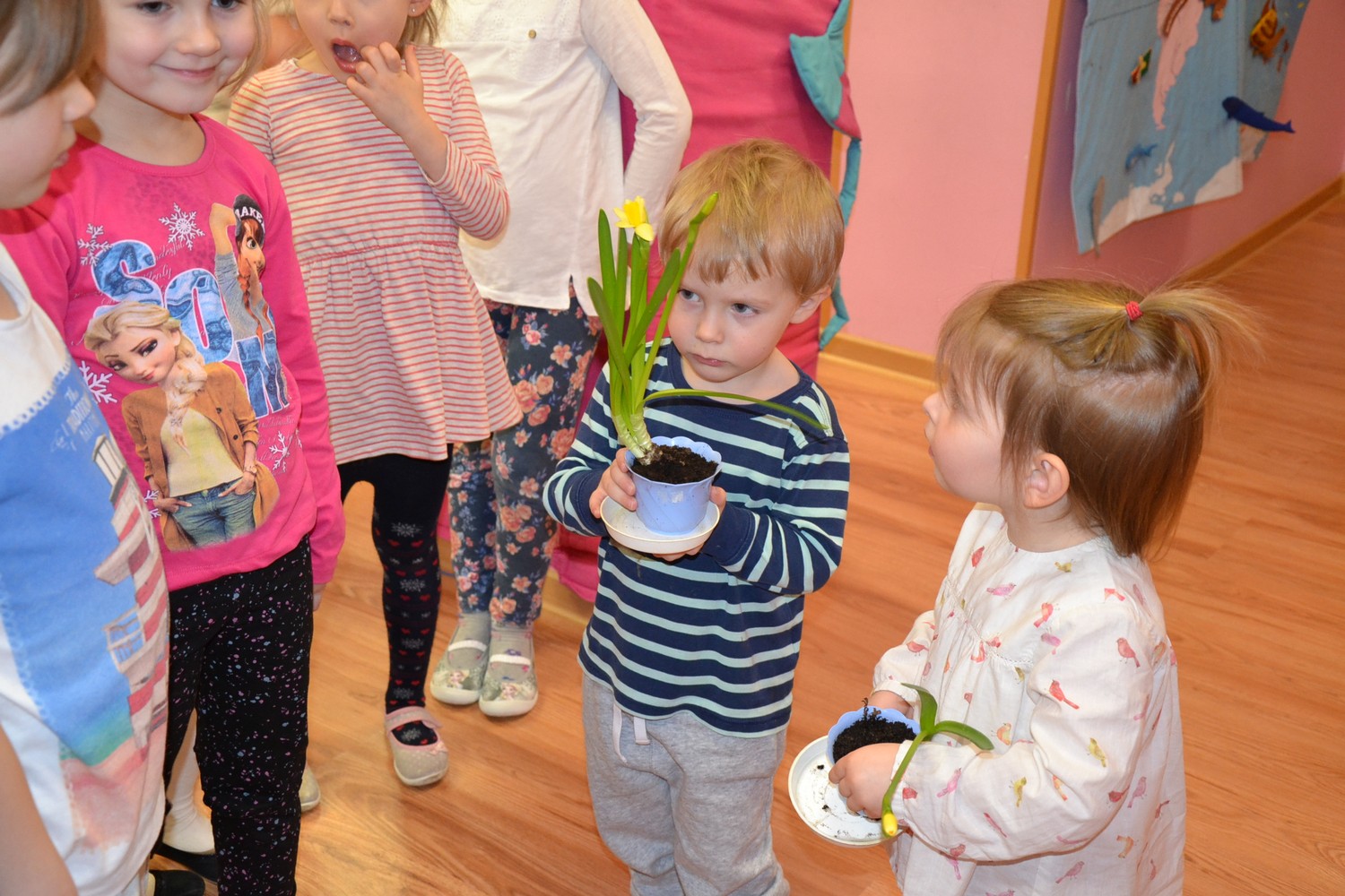 Dzieci z grupy I bardzo chęt­nie włą­czyły się w prace zwią­zane z zakła­da­niem zie­lo­nego ogródka w naszej sali. Sadziły żon­kile, cebulki na szczy­pio­rek oraz nasiona kopru i dyni. Posa­dzo­nymi kwia­tami obda­ro­wały rów­nież dzieci pozo­sta­łych grup.
