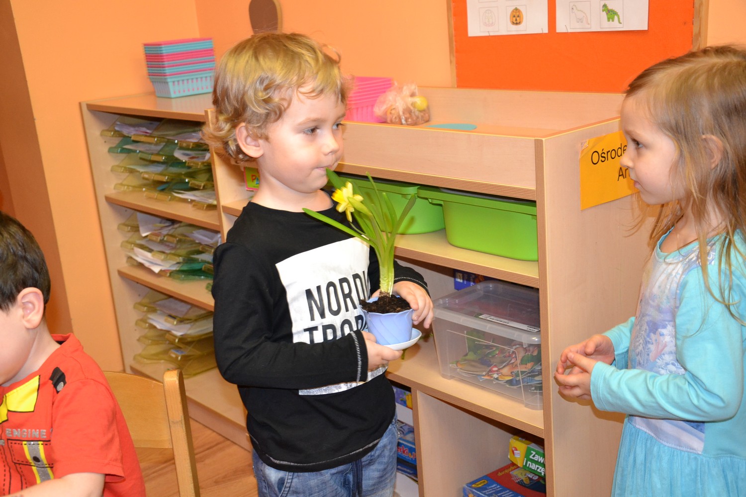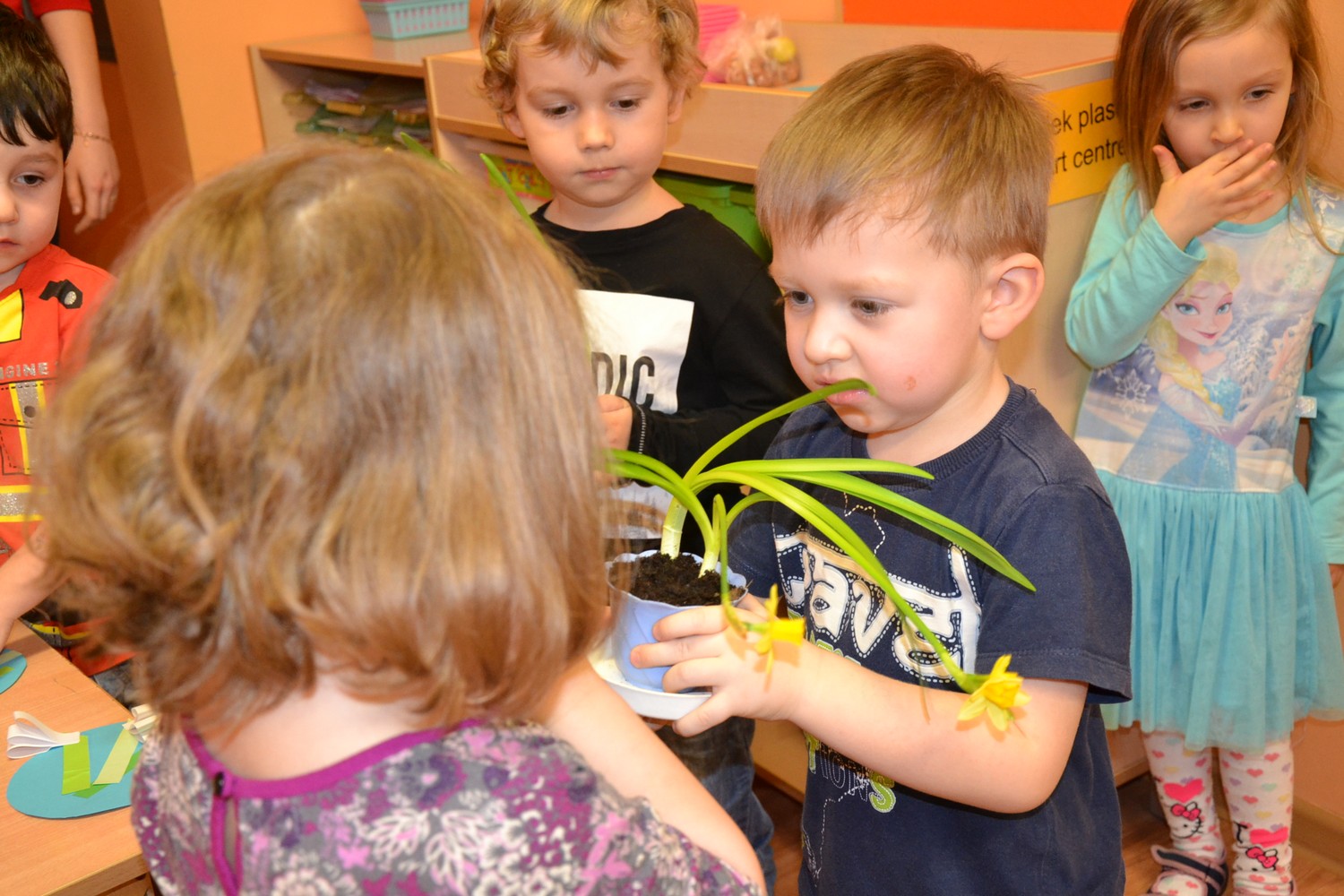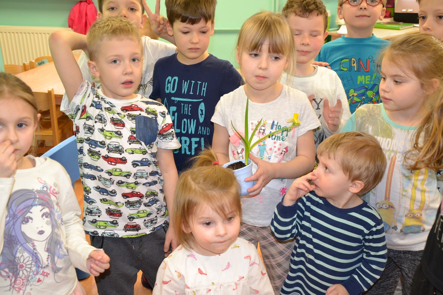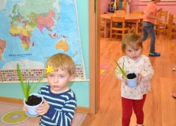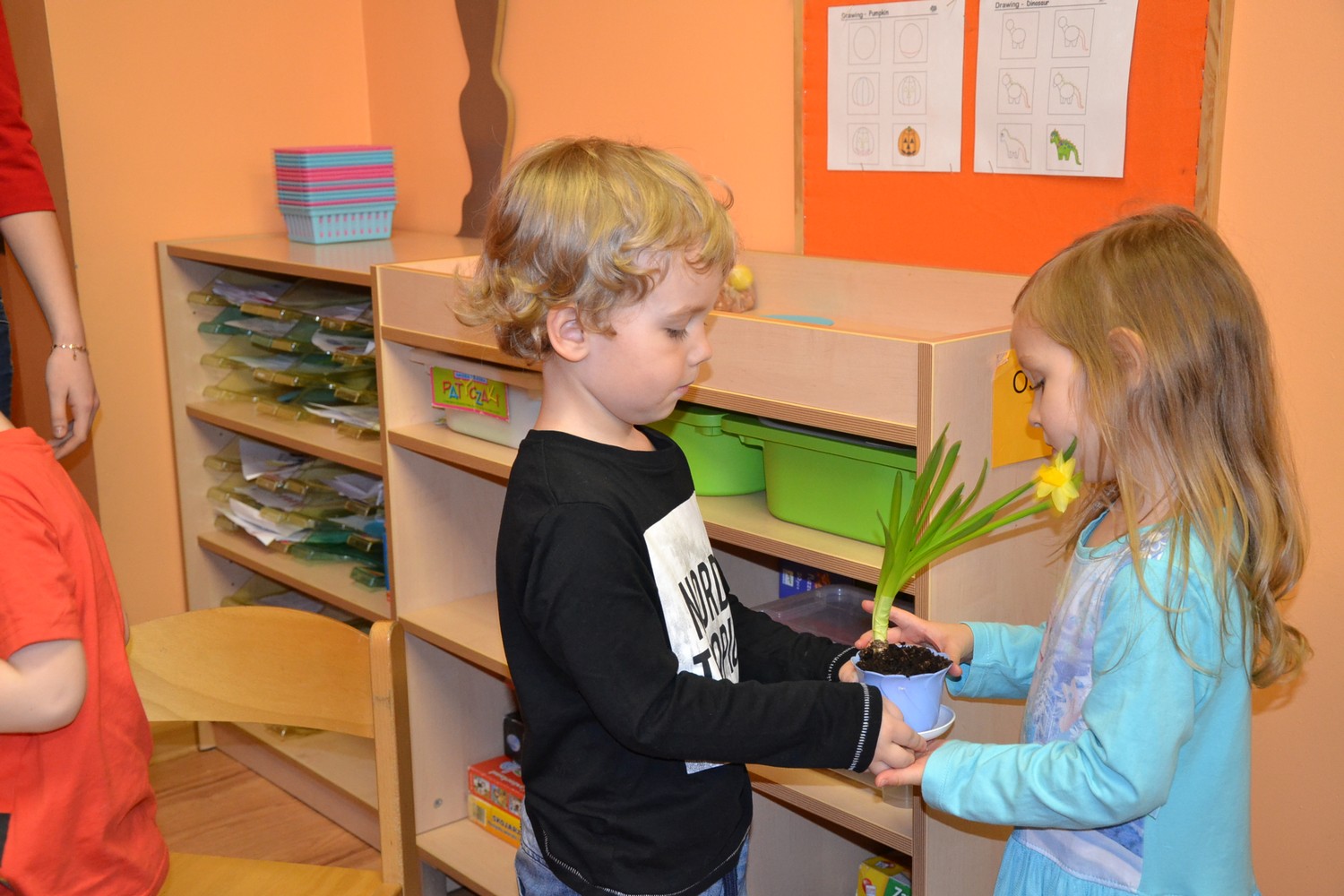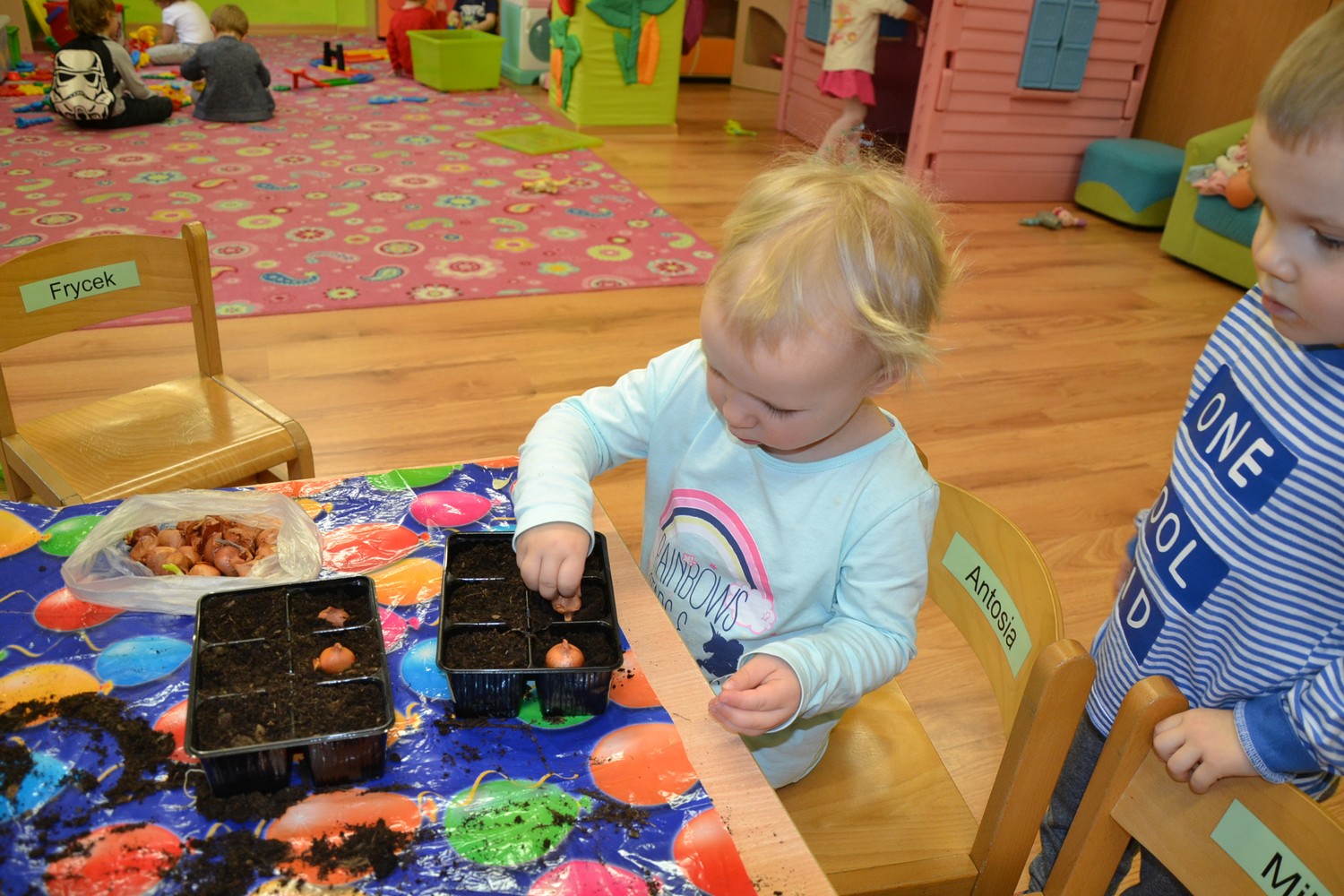 Dzieci z grupy I bardzo chęt­nie włą­czyły się w prace zwią­zane z zakła­da­niem zie­lo­nego ogródka w naszej sali. Sadziły żon­kile, cebulki na szczy­pio­rek oraz nasiona kopru i dyni. Posa­dzo­nymi kwia­tami obda­ro­wały rów­nież dzieci pozo­sta­łych grup.