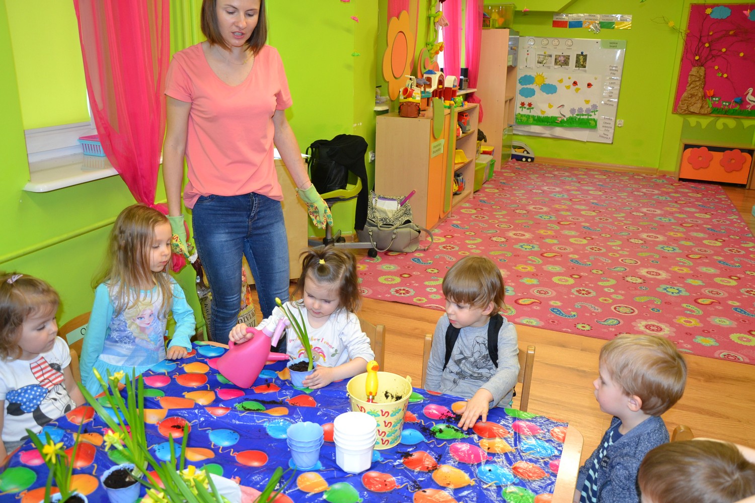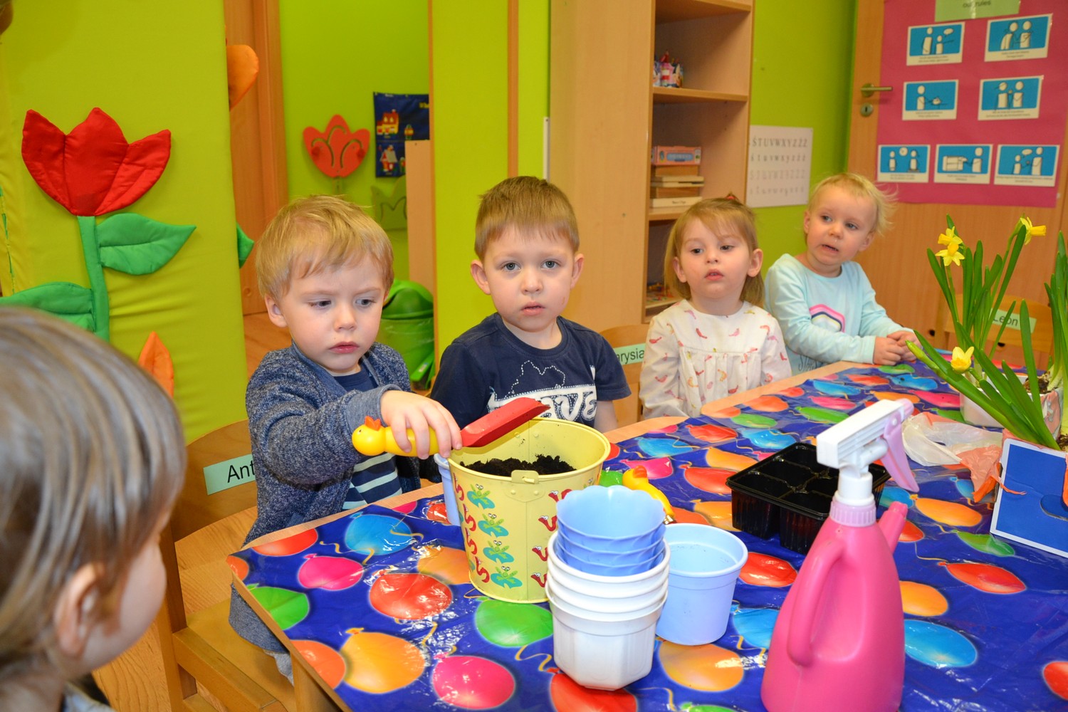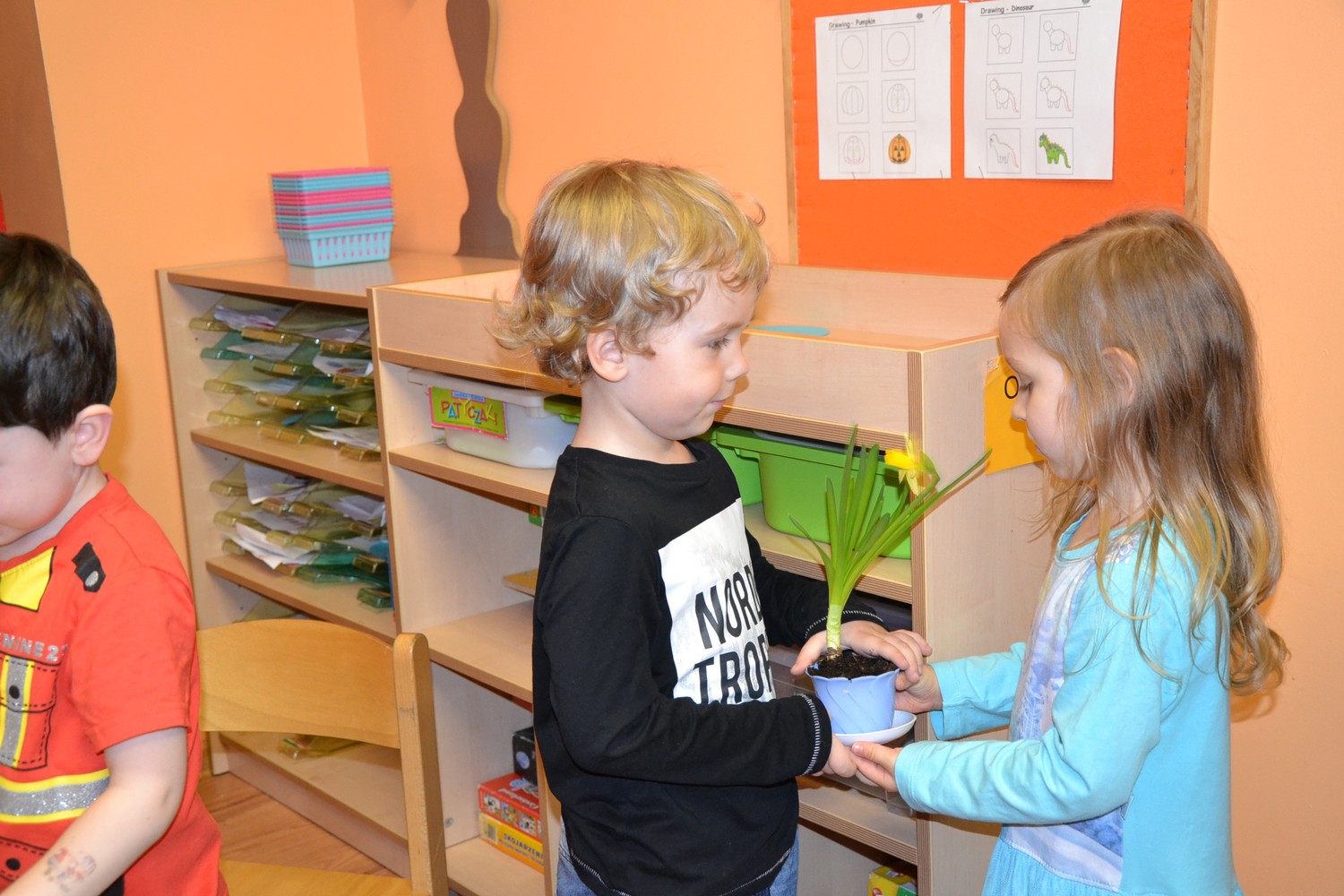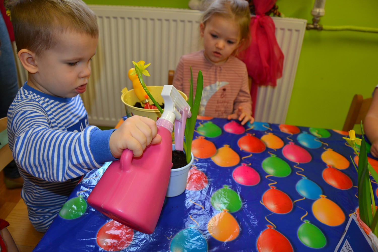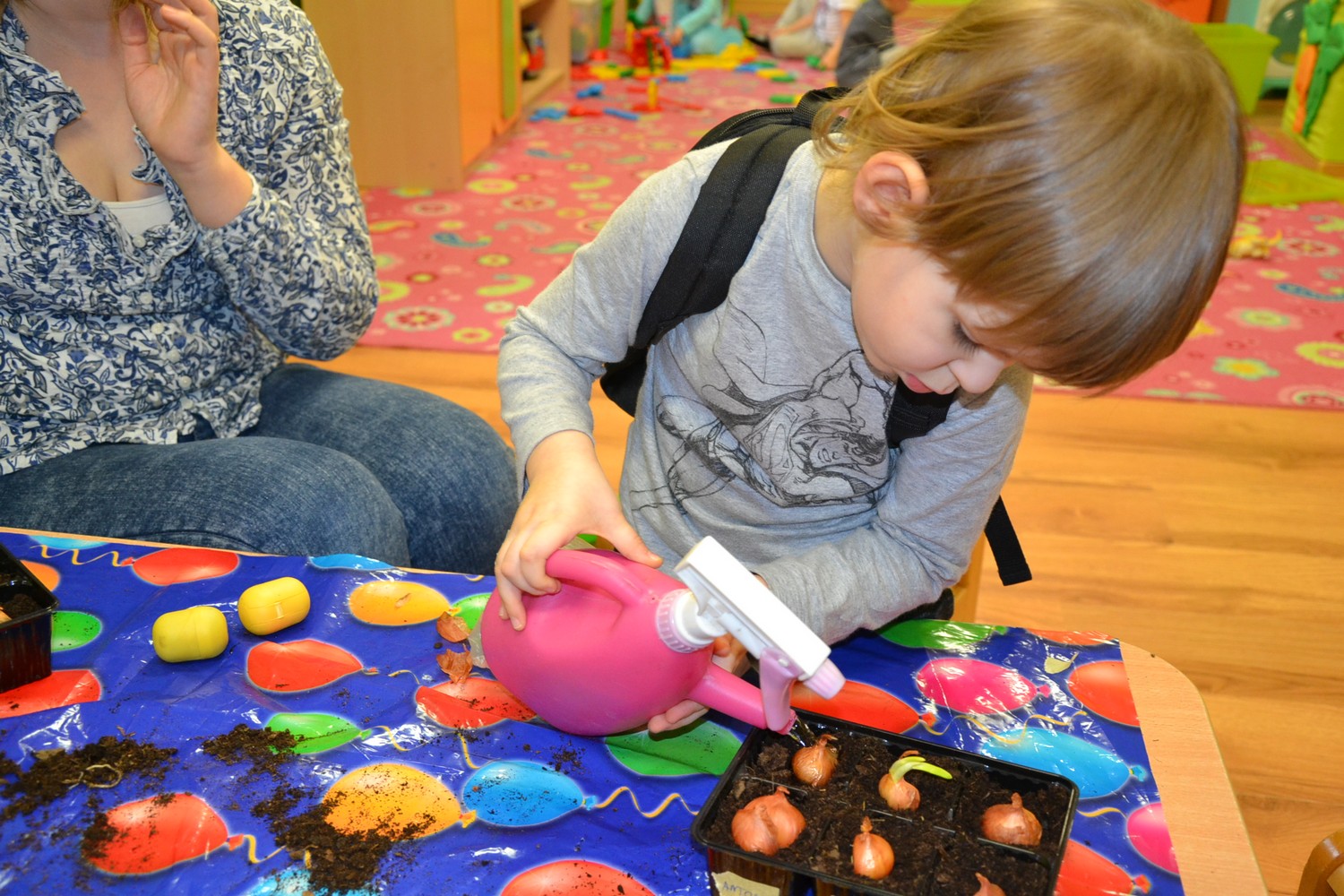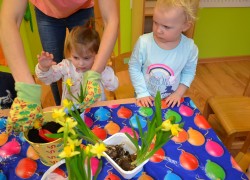 Dzieci z grupy I bardzo chęt­nie włą­czyły się w prace zwią­zane z zakła­da­niem zie­lo­nego ogródka w naszej sali. Sadziły żon­kile, cebulki na szczy­pio­rek oraz nasiona kopru i dyni. Posa­dzo­nymi kwia­tami obda­ro­wały rów­nież dzieci pozo­sta­łych grup.