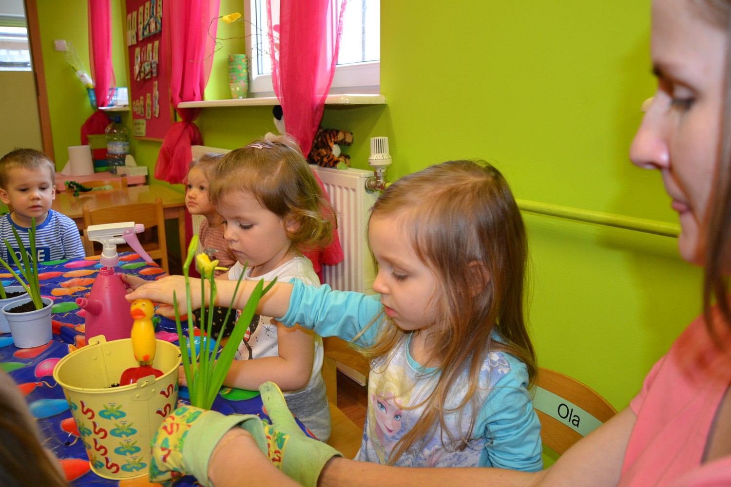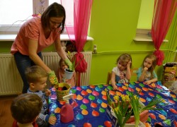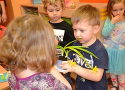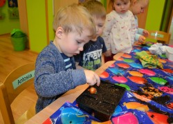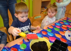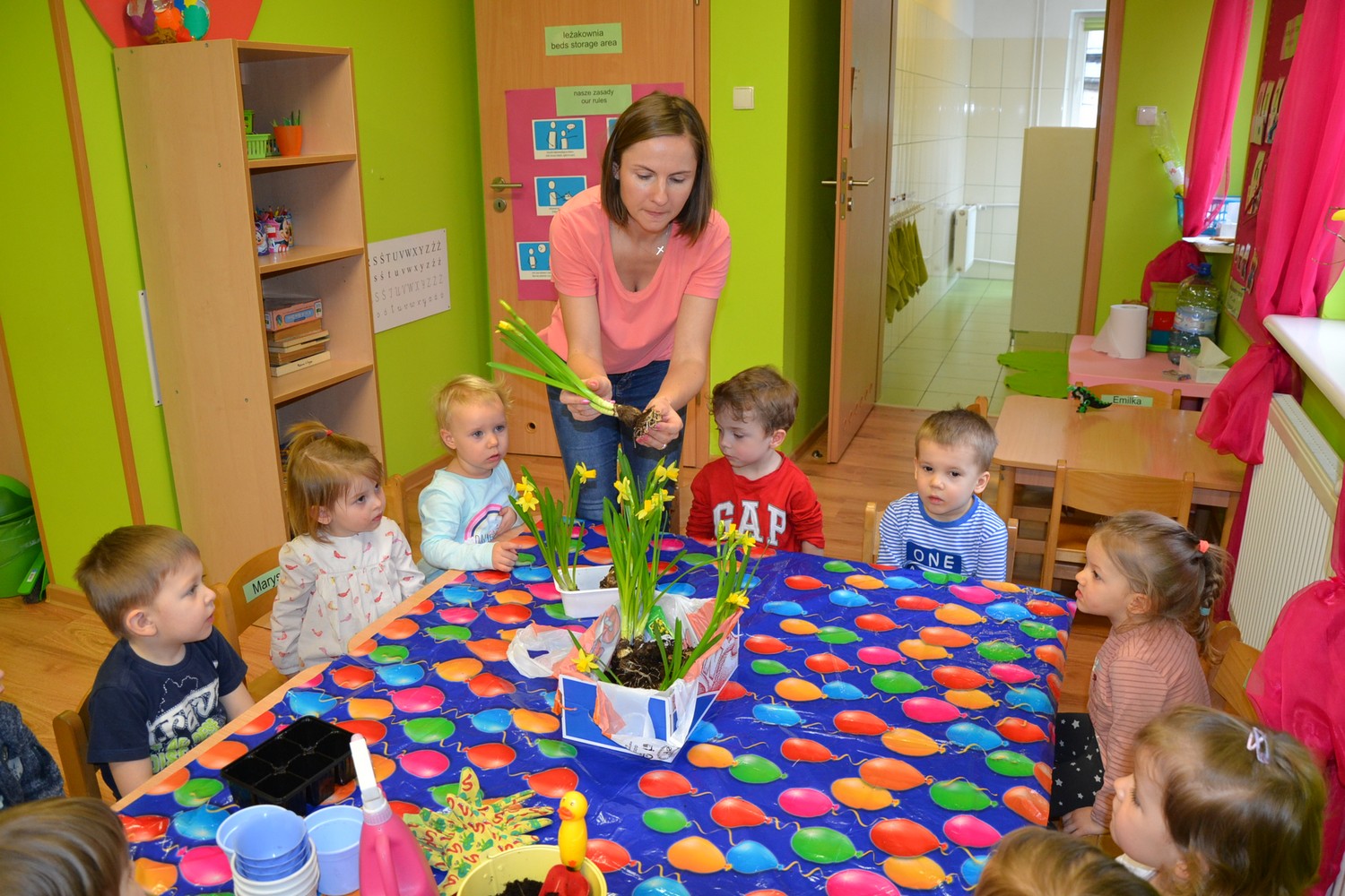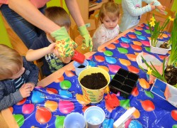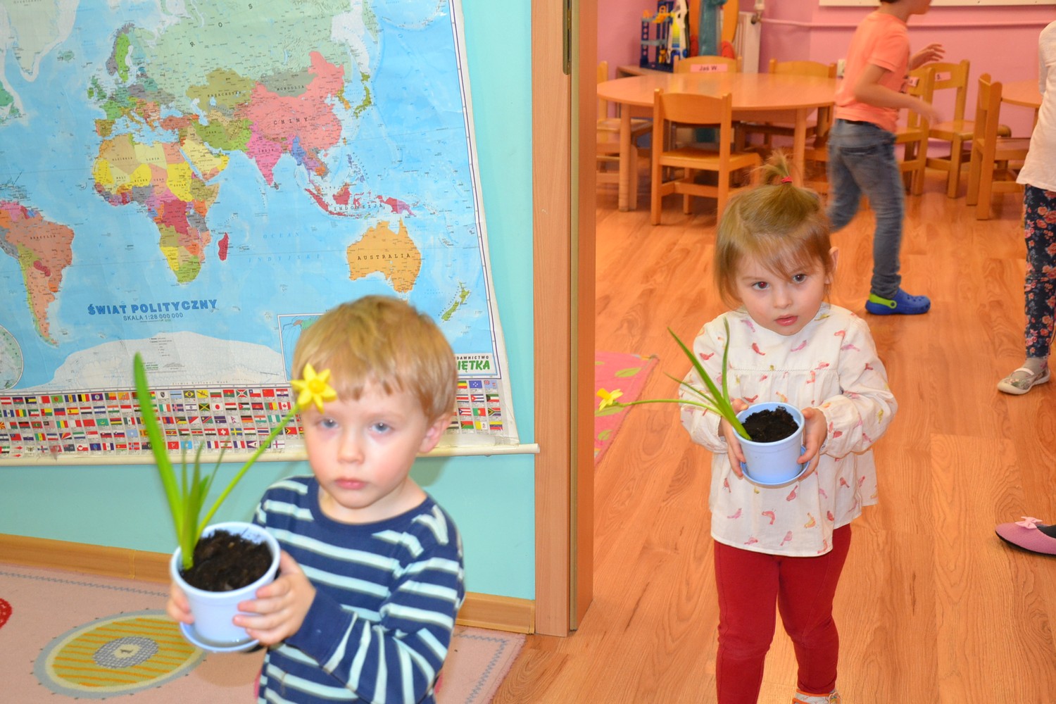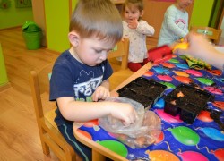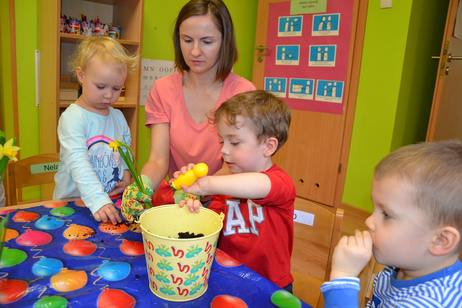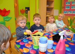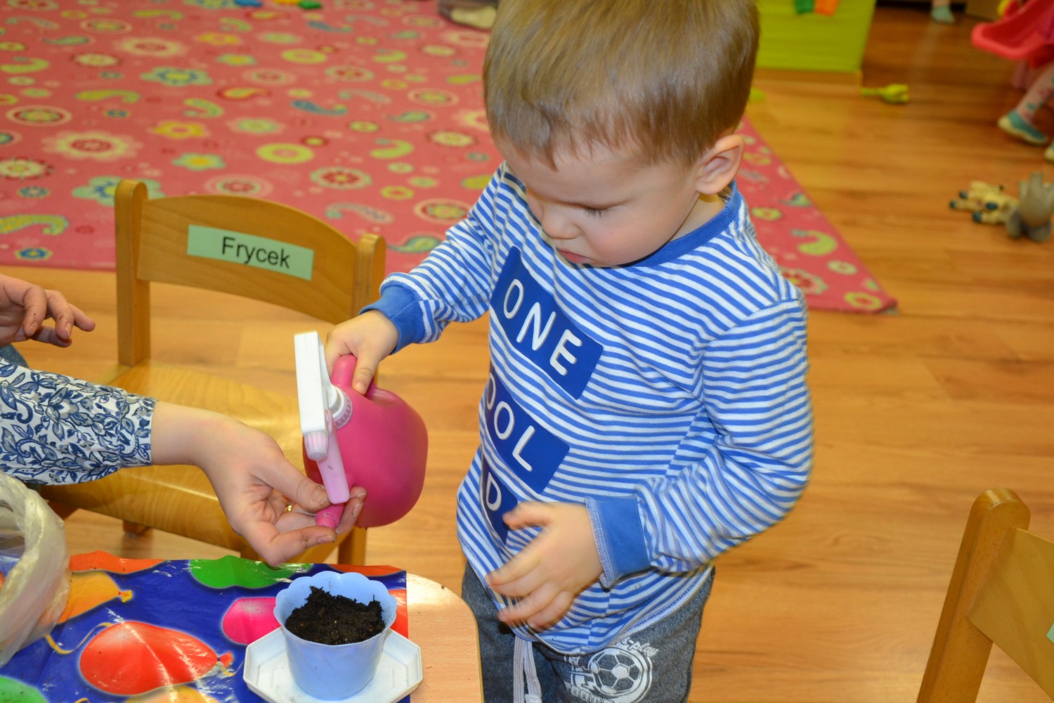 Dzieci z grupy I bardzo chęt­nie włą­czyły się w prace zwią­zane z zakła­da­niem zie­lo­nego ogródka w naszej sali. Sadziły żon­kile, cebulki na szczy­pio­rek oraz nasiona kopru i dyni. Posa­dzo­nymi kwia­tami obda­ro­wały rów­nież dzieci pozo­sta­łych grup.
