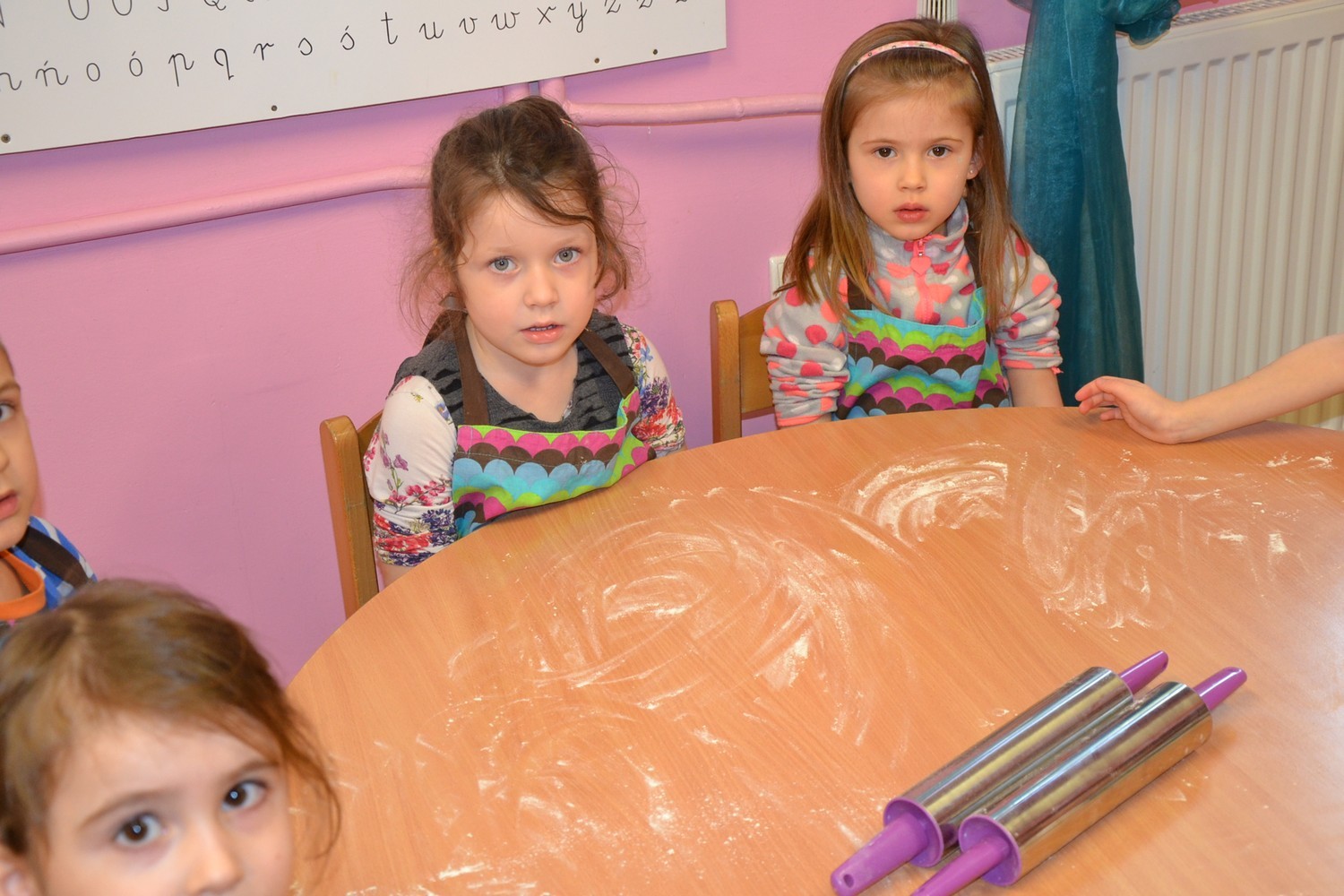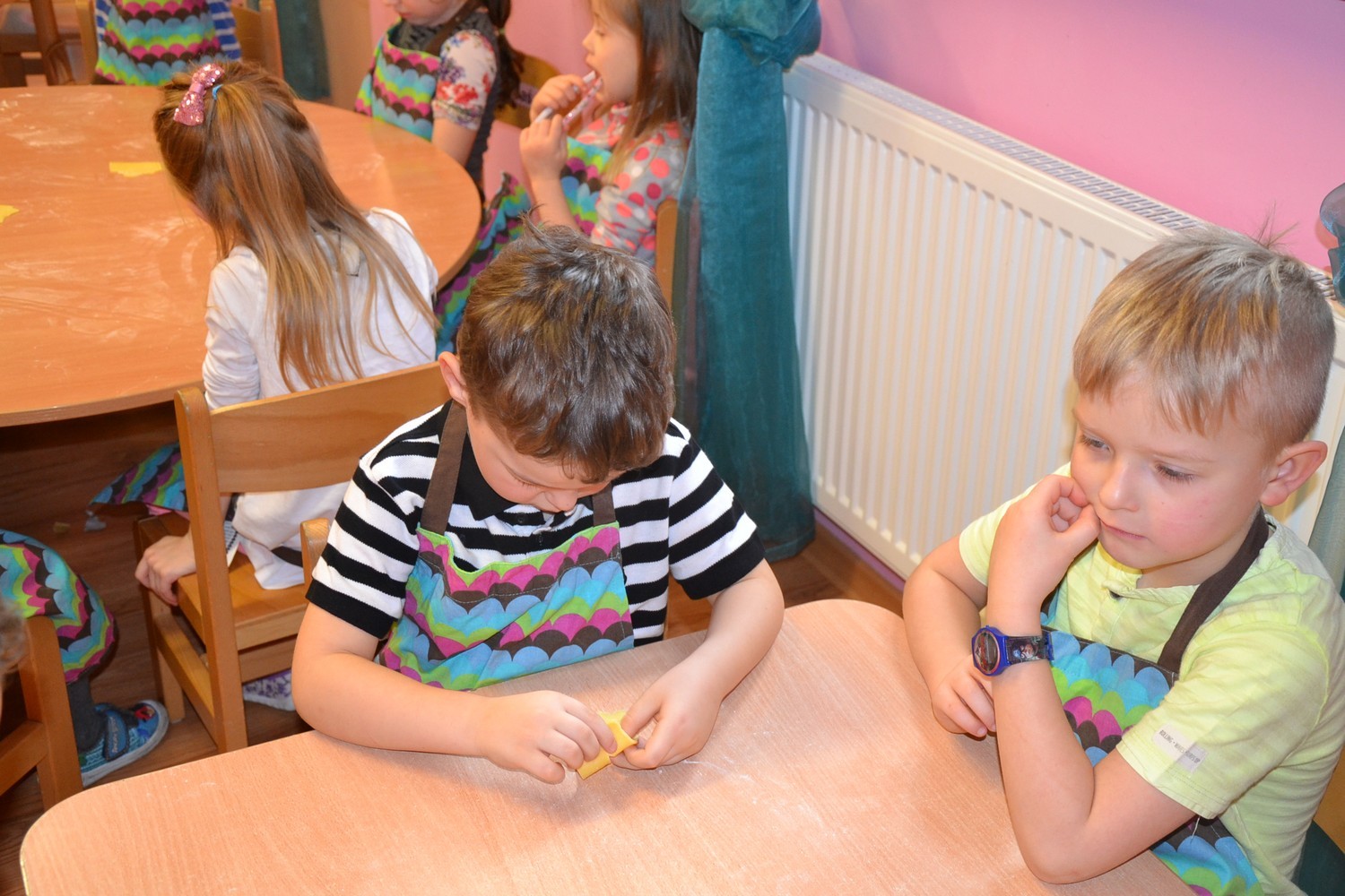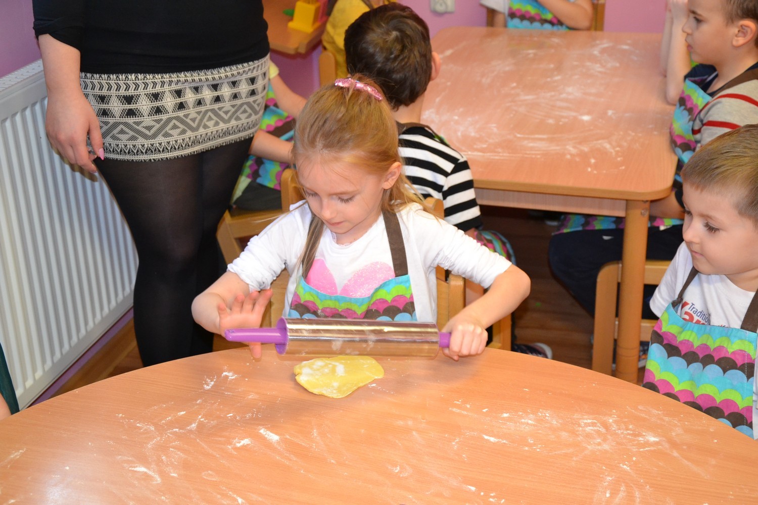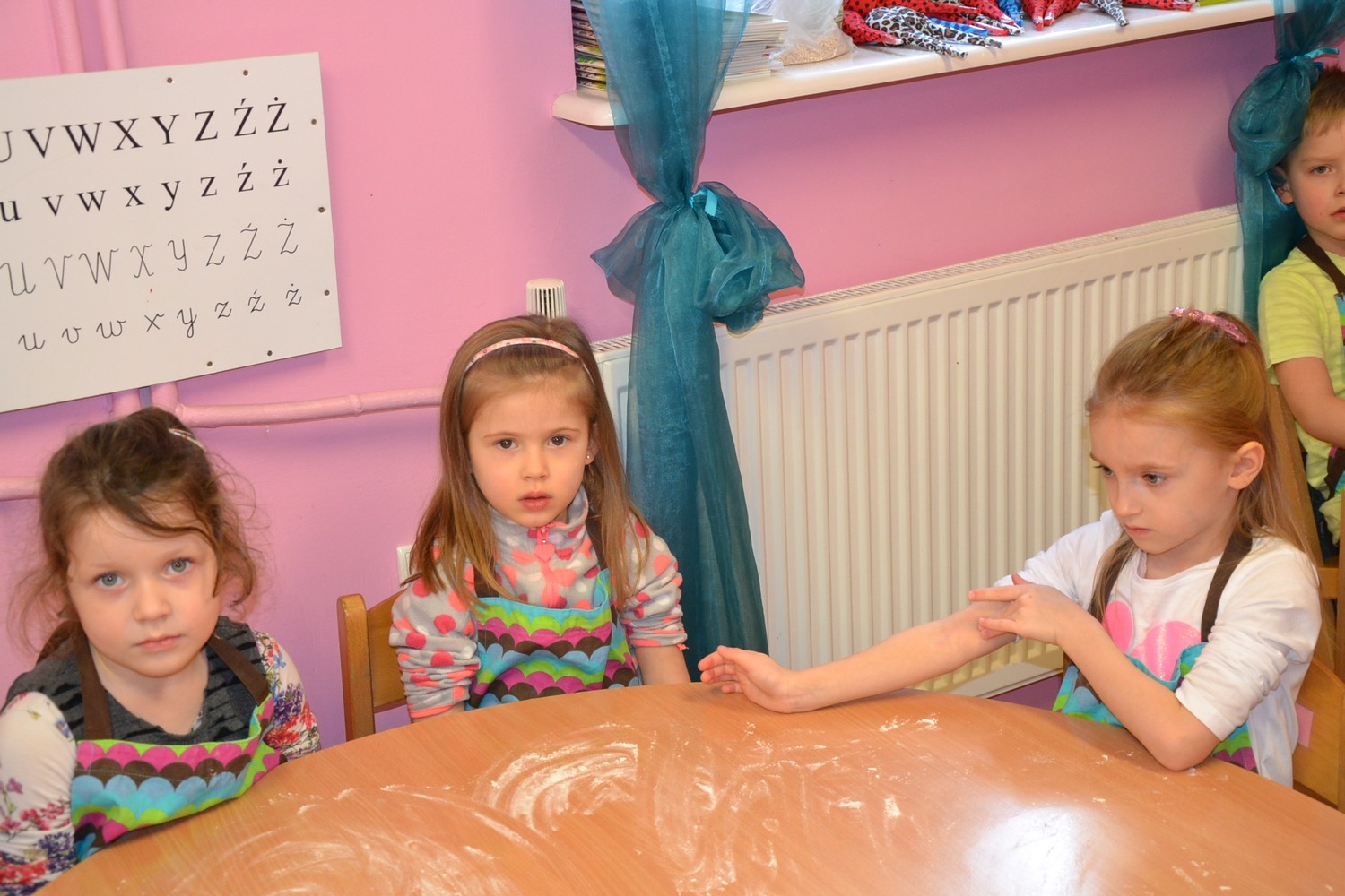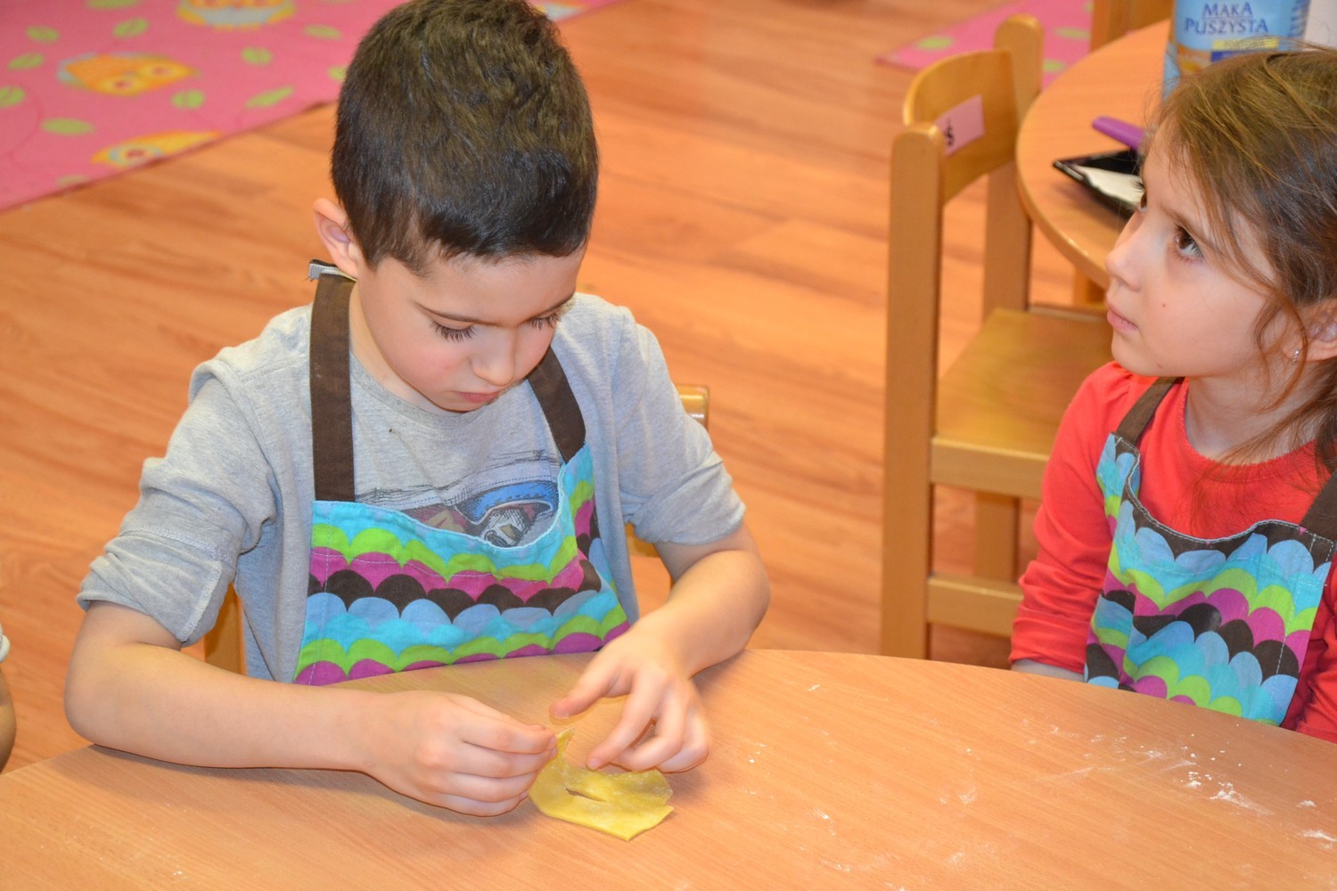 W tłusty czwartek w naszej grupie dzieci upiekły faworki. Pani Grażynka przygotowała nam wcześniej w kuchni ciasto, a my podzieliliśmy je na mniejsze kawałki. Starannie rozwałkowaliśmy je i wycieliśmy z niego kawałki, z których stworzyliśmy faworki. Następnie trafiły do piekarnika, a później zjedliśmy je na podwieczorek. Były pyszne!