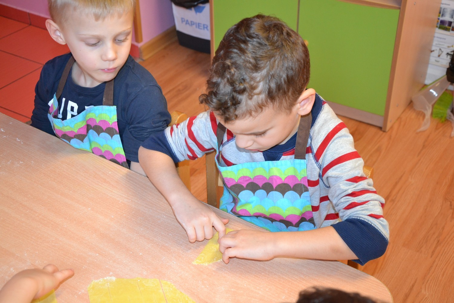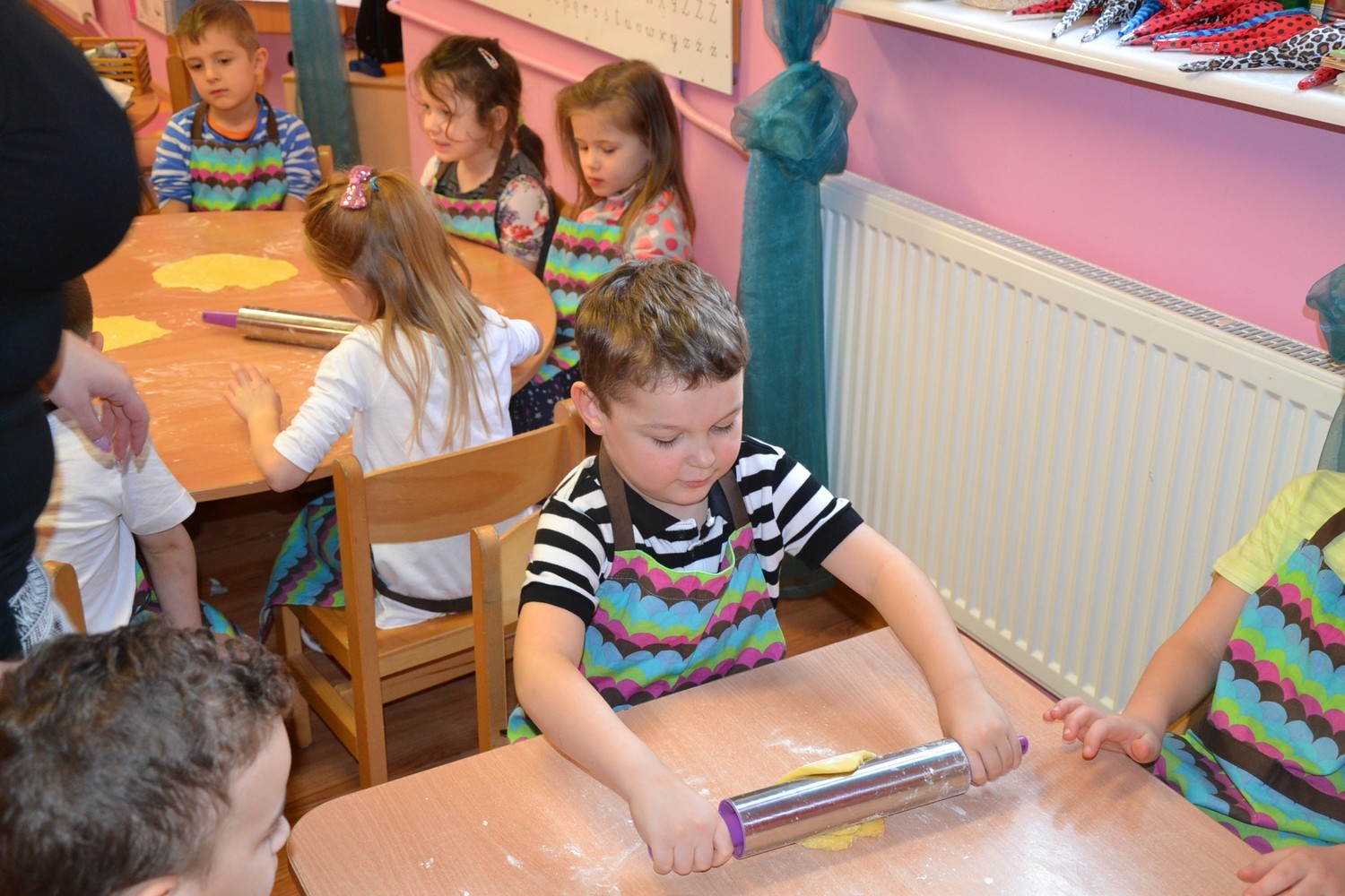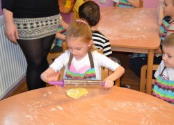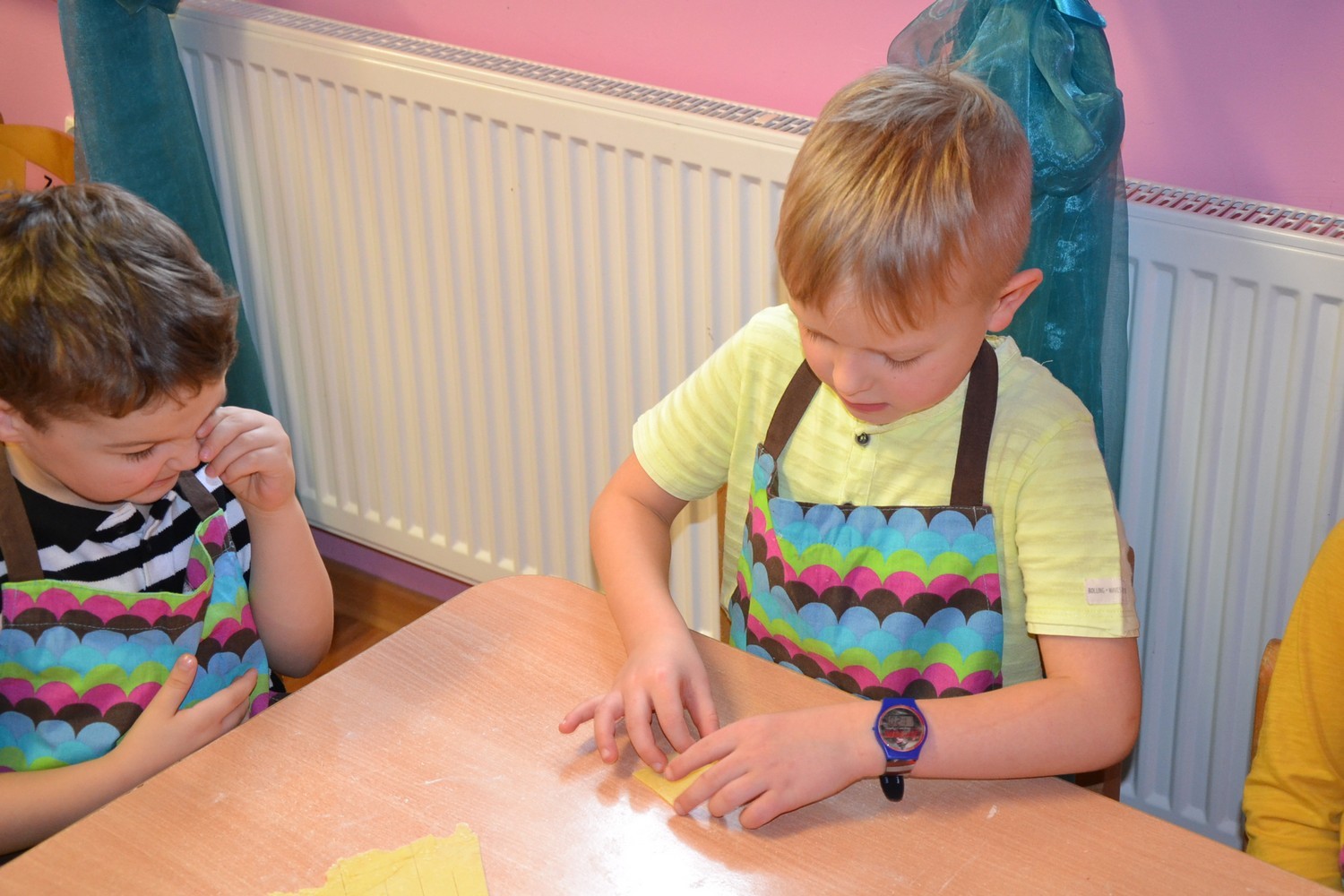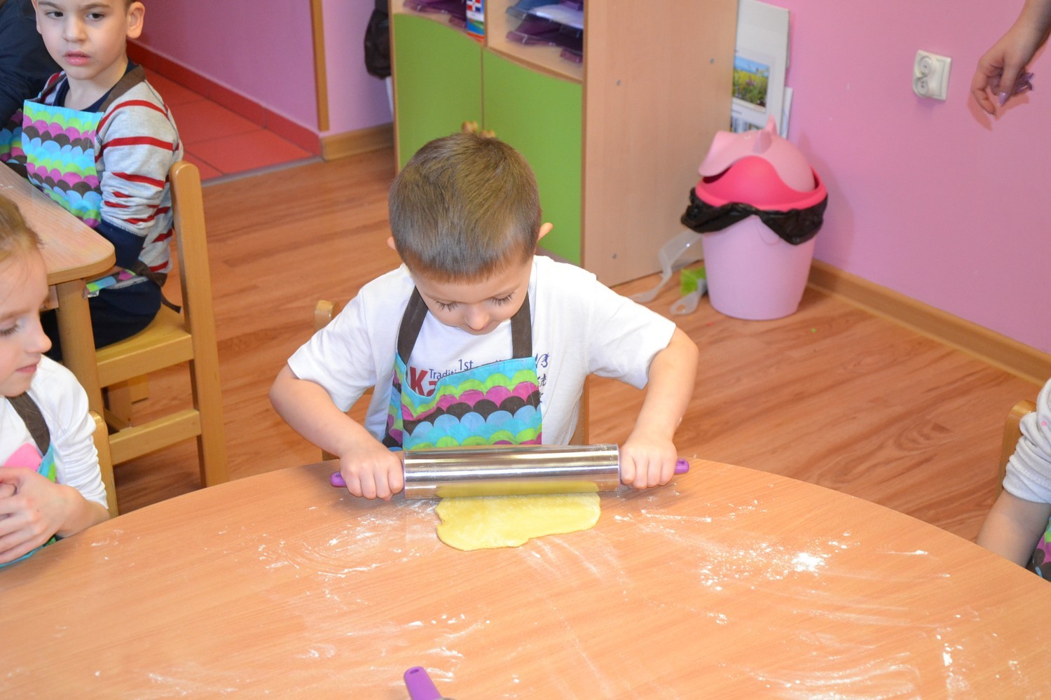 W tłusty czwartek w naszej grupie dzieci upiekły faworki. Pani Grażynka przygotowała nam wcześniej w kuchni ciasto, a my podzieliliśmy je na mniejsze kawałki. Starannie rozwałkowaliśmy je i wycieliśmy z niego kawałki, z których stworzyliśmy faworki. Następnie trafiły do piekarnika, a później zjedliśmy je na podwieczorek. Były pyszne!