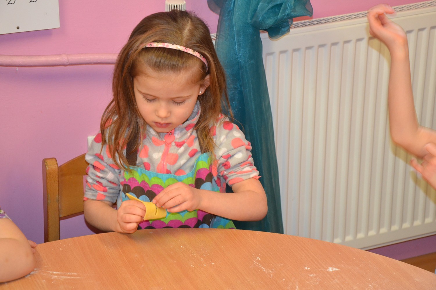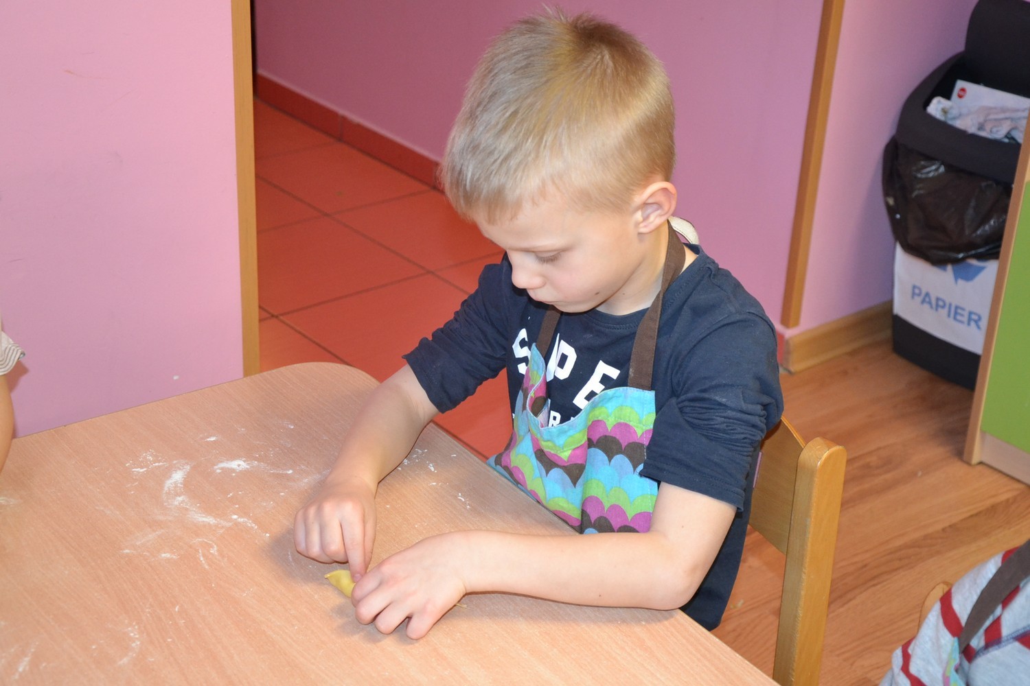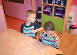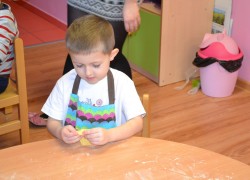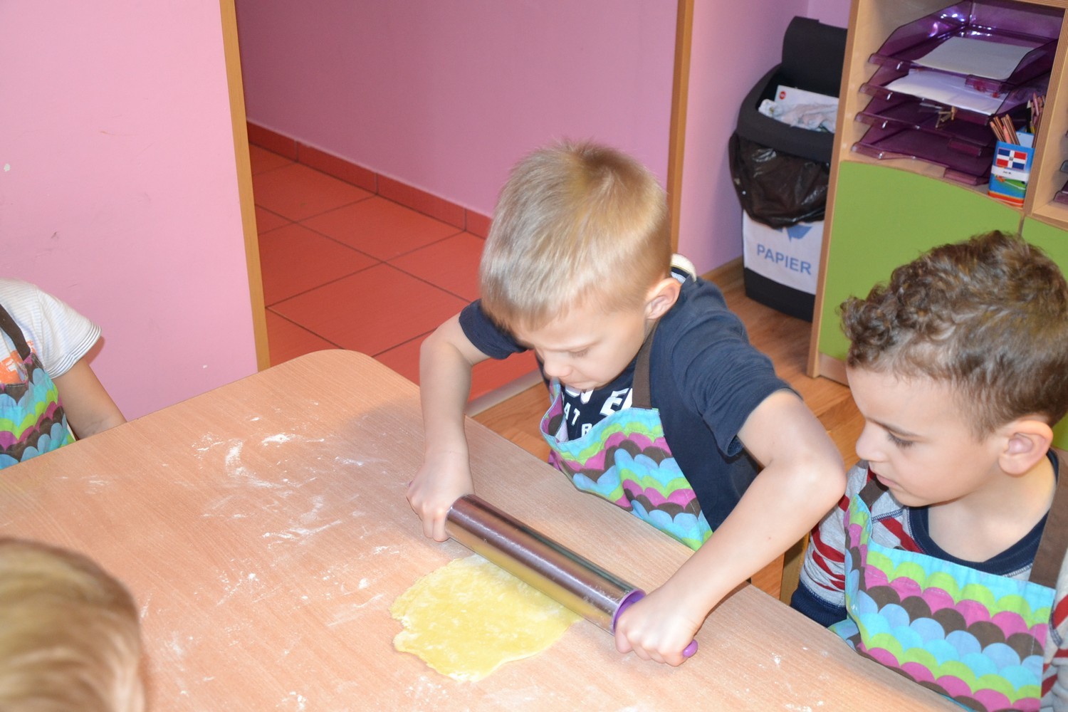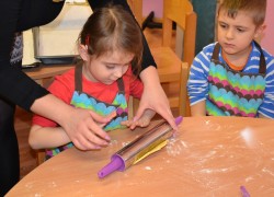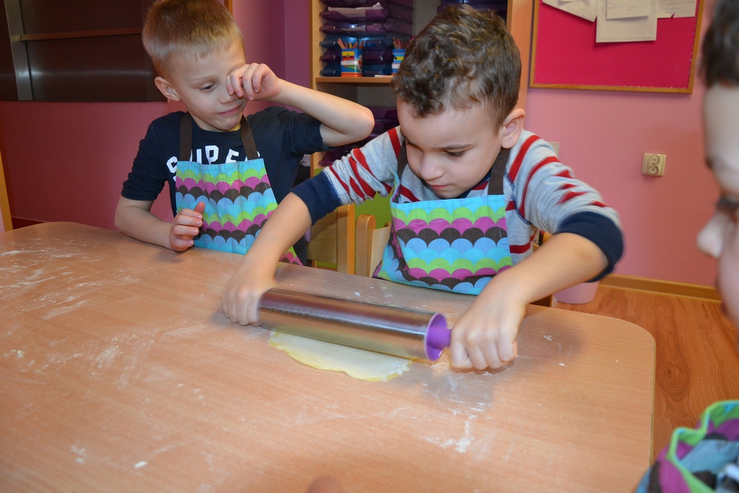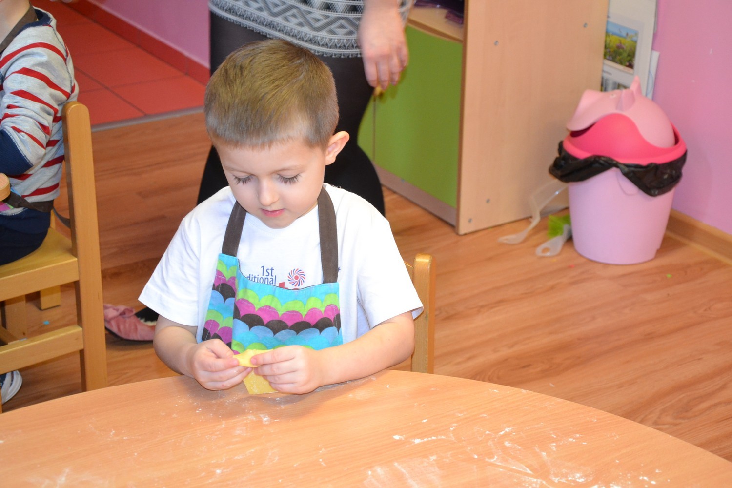 W tłusty czwartek w naszej grupie dzieci upiekły faworki. Pani Grażynka przygotowała nam wcześniej w kuchni ciasto, a my podzieliliśmy je na mniejsze kawałki. Starannie rozwałkowaliśmy je i wycieliśmy z niego kawałki, z których stworzyliśmy faworki. Następnie trafiły do piekarnika, a później zjedliśmy je na podwieczorek. Były pyszne!