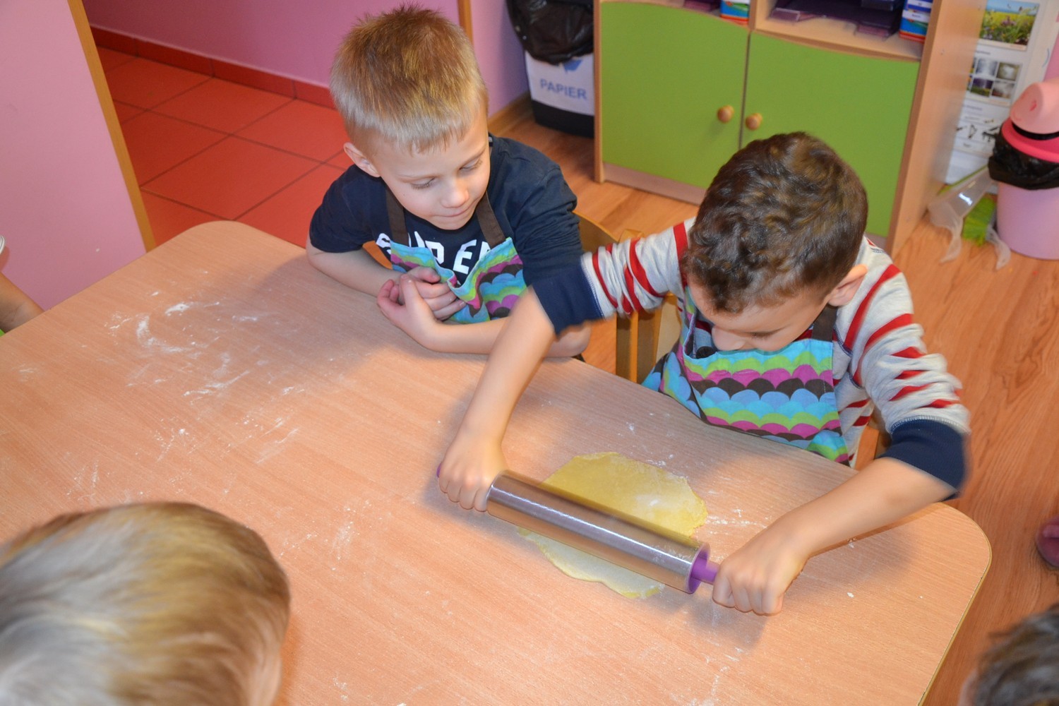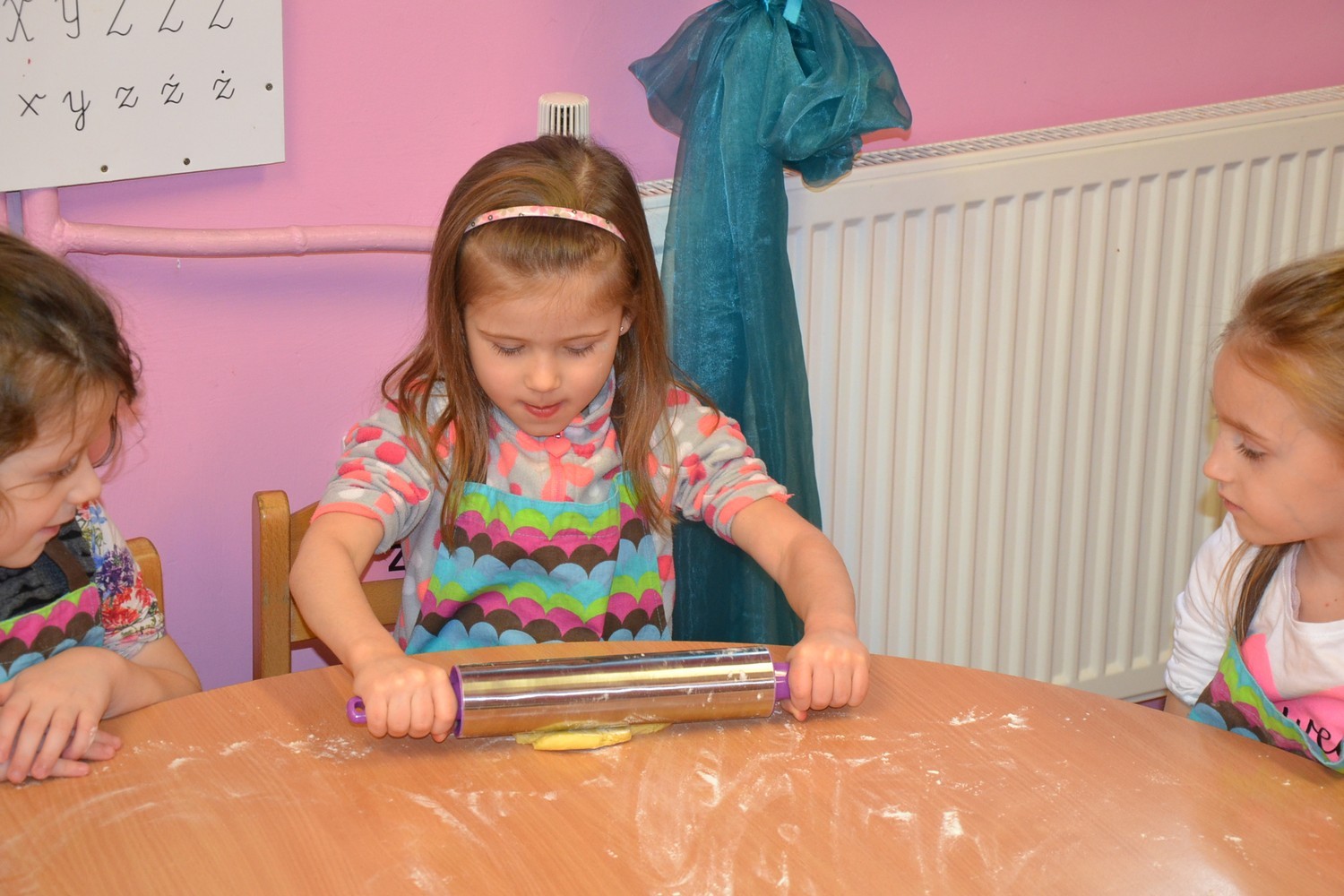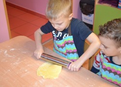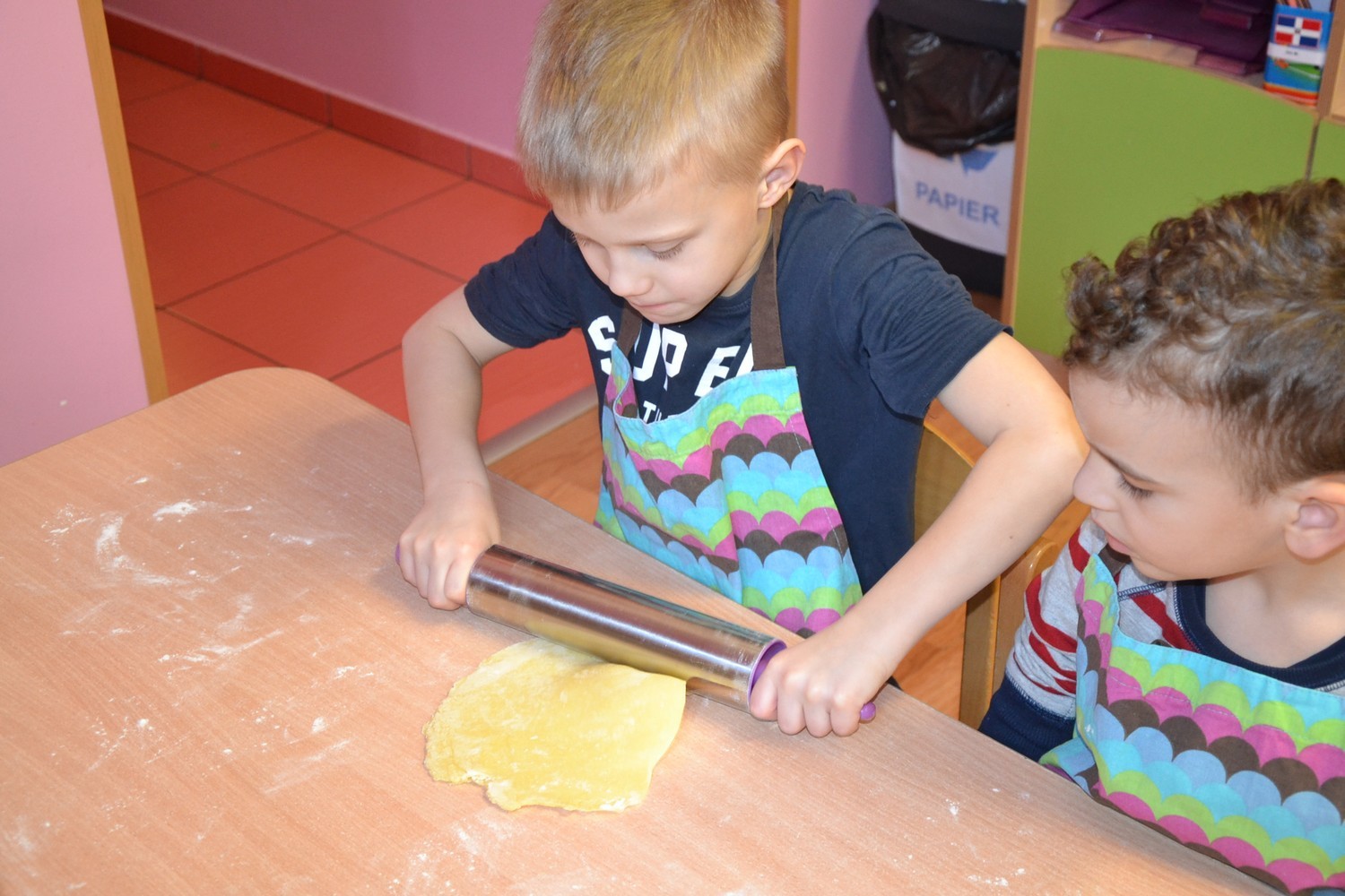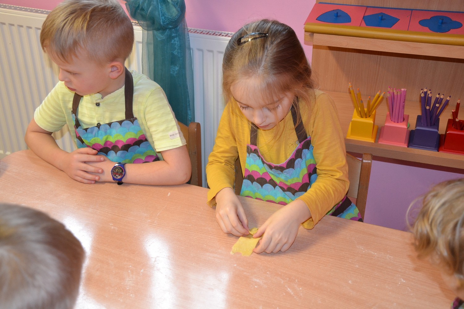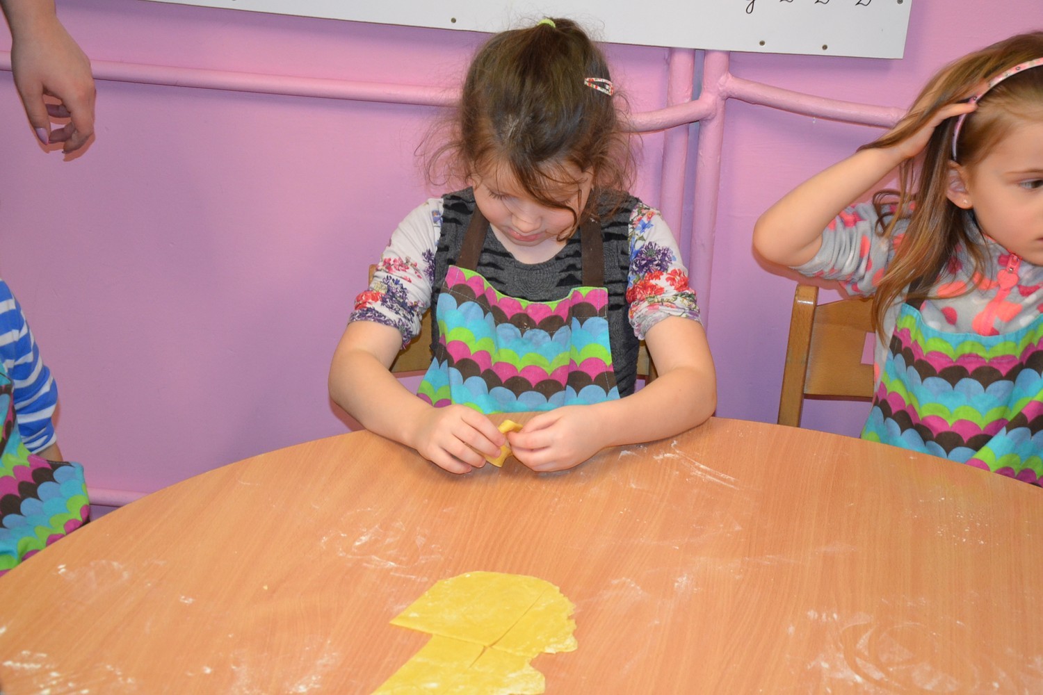 W tłusty czwartek w naszej grupie dzieci upiekły faworki. Pani Grażynka przygotowała nam wcześniej w kuchni ciasto, a my podzieliliśmy je na mniejsze kawałki. Starannie rozwałkowaliśmy je i wycieliśmy z niego kawałki, z których stworzyliśmy faworki. Następnie trafiły do piekarnika, a później zjedliśmy je na podwieczorek. Były pyszne!