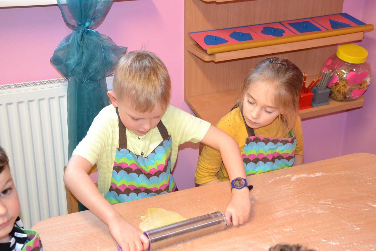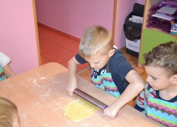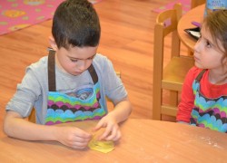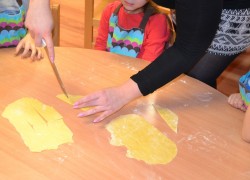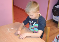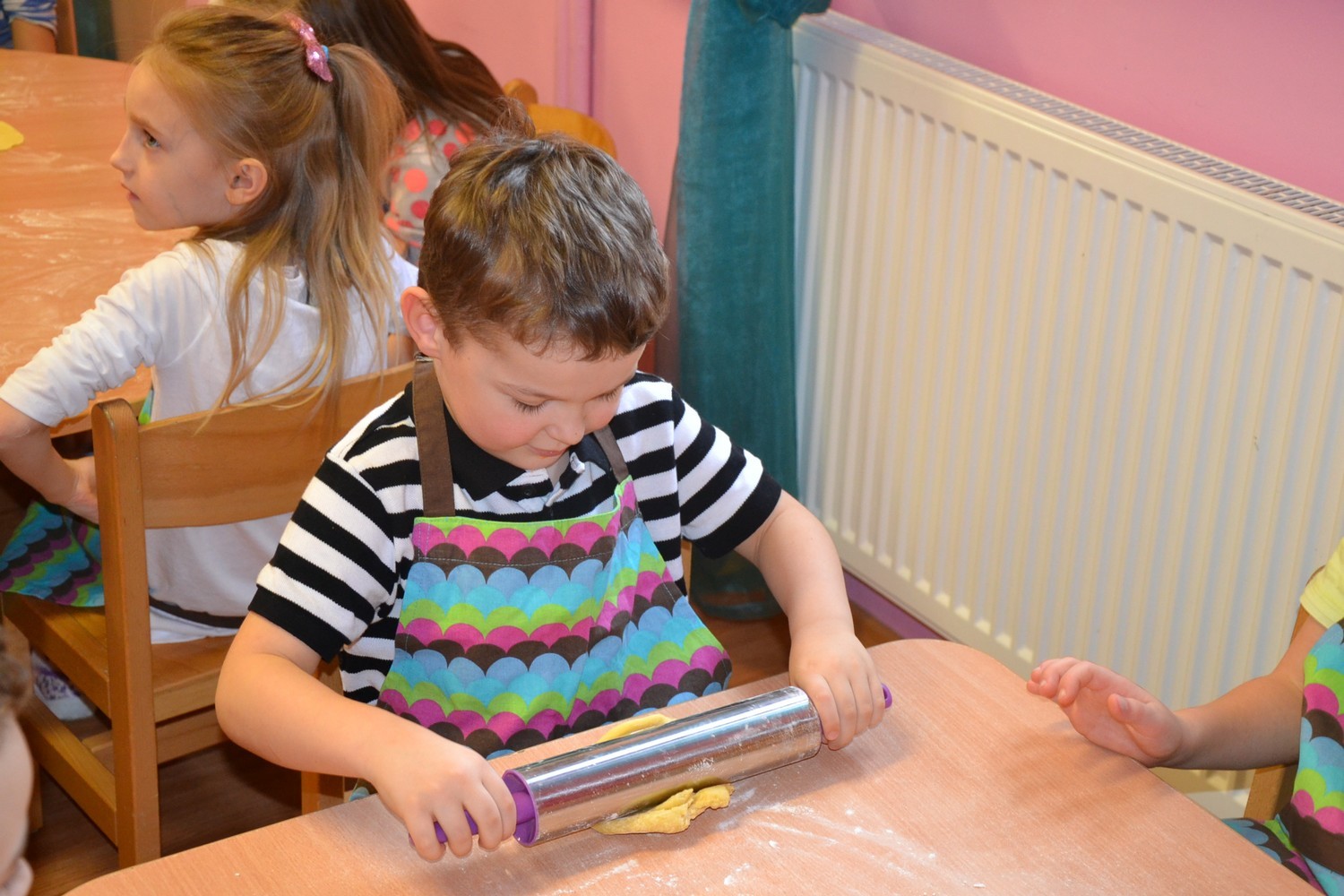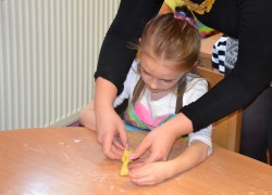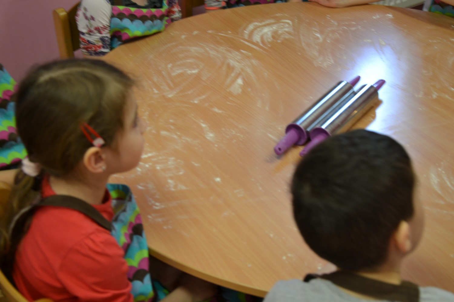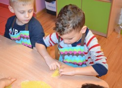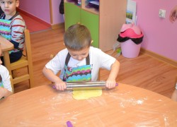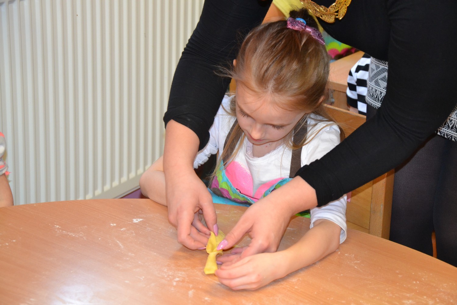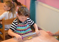 W tłusty czwartek w naszej grupie dzieci upiekły faworki. Pani Grażynka przygotowała nam wcześniej w kuchni ciasto, a my podzieliliśmy je na mniejsze kawałki. Starannie rozwałkowaliśmy je i wycieliśmy z niego kawałki, z których stworzyliśmy faworki. Następnie trafiły do piekarnika, a później zjedliśmy je na podwieczorek. Były pyszne!